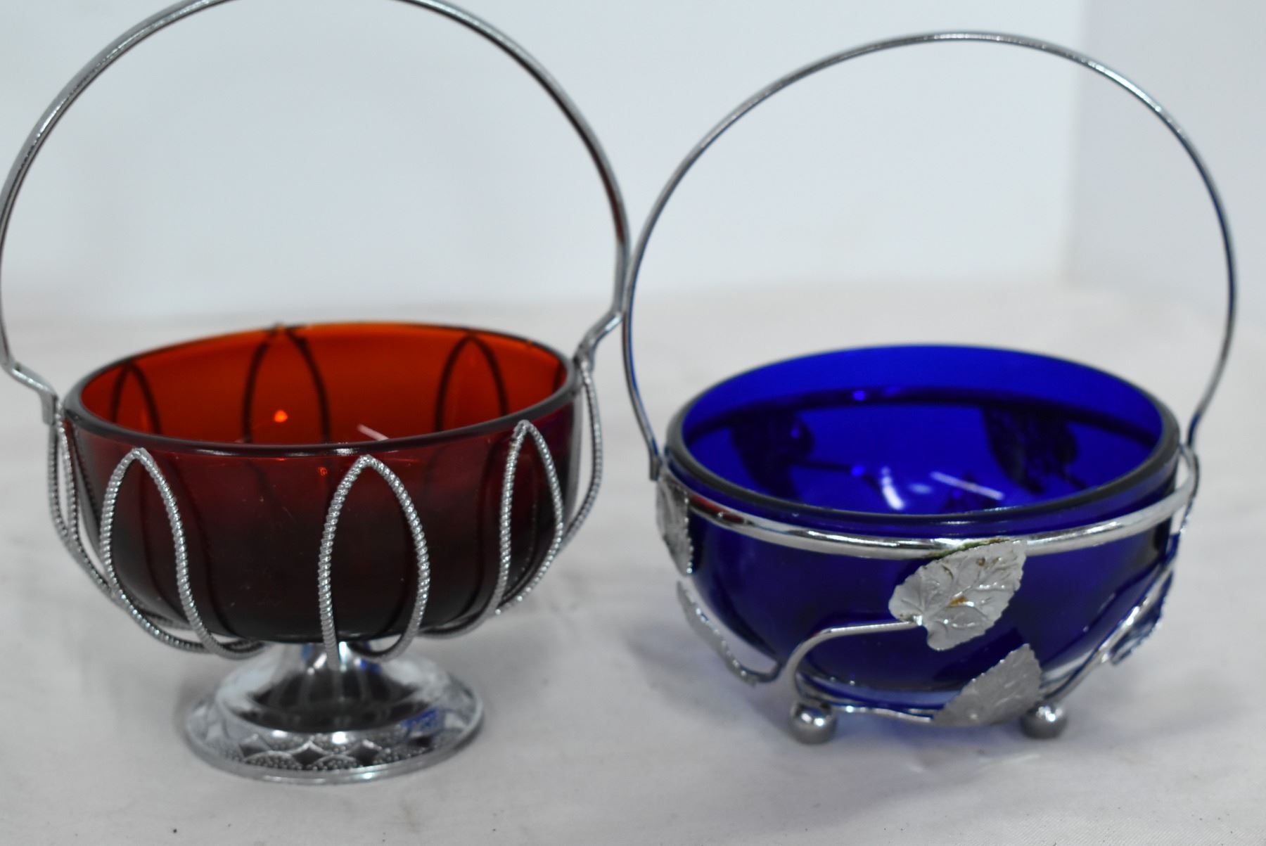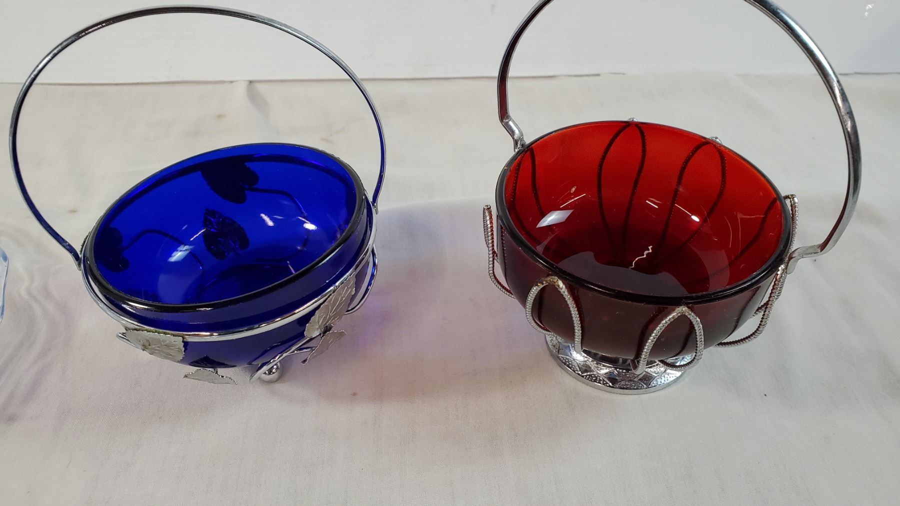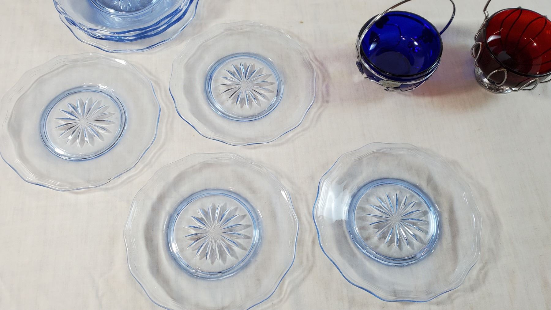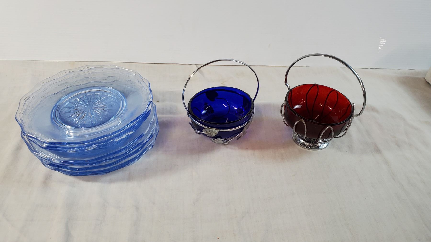8 Light Blue Glass Plates , 2 Coloured Glass Bowls w/ Metal Handles