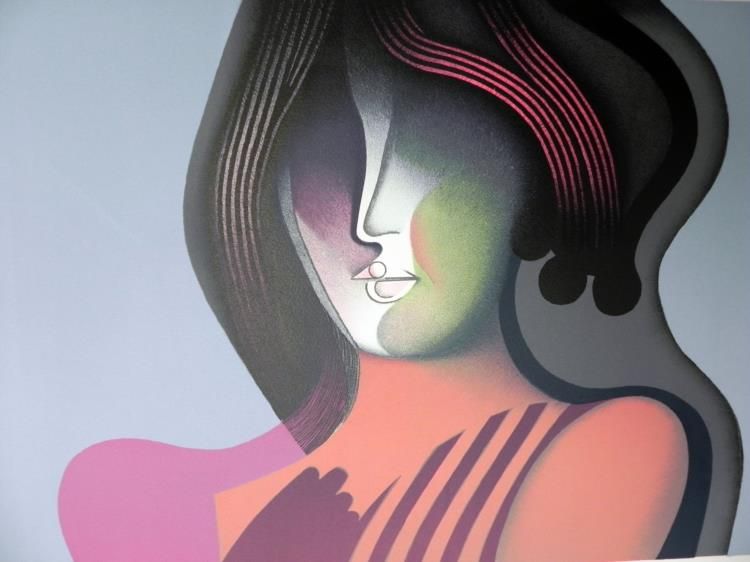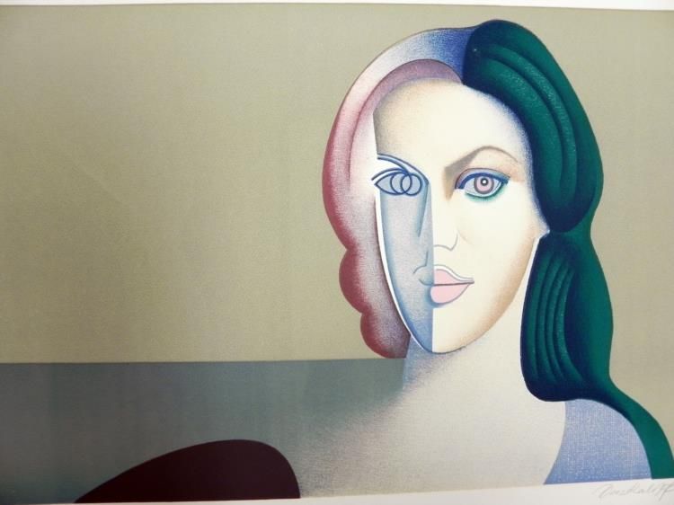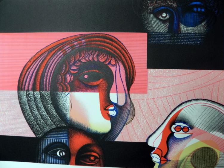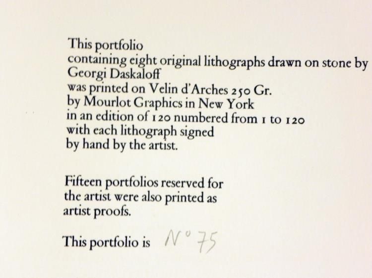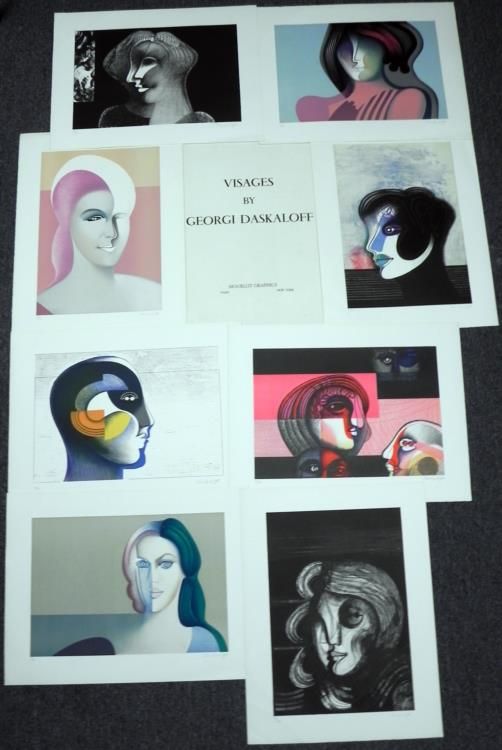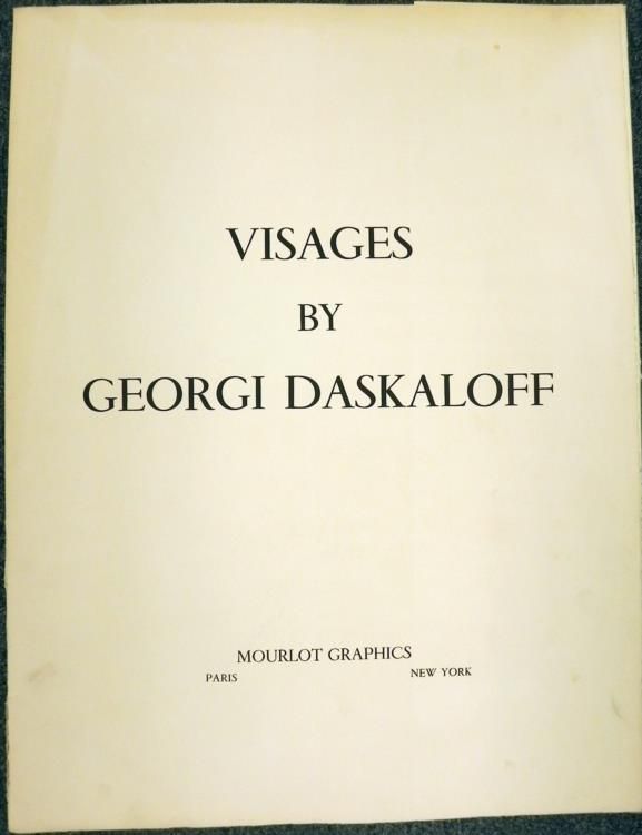 Artist: Georgi DaskaloffTitle: VisagesMedium: Colored lithographSignature: Signed in pencil, lower rightEdition: Of 120 in pencil, lower leftImage size: 14 1/4" x 20 1/2"Paper size: 19 1/2" x 24"Portfolio size: 26" x 20"Publisher: Mourlot Graphics - 1971Lithographs Condition: Varies from Good - ExcellentBiographyGeorgi Daskaloff (1923 -2005) was born in Sofia, Bulgaria and attended the art school at Sofia University, graduating in 1949. He 'defected' to the West in 1960, living in Paris before moving on to New York. Daskaloff painted in the 1960s and 1970s in a pop-art influenced abstracted figurative style using bright colours. He showed widely, having solo exhibitions in Copenhagen, Brussels, New York and Geneva as well as at Galerie Jacques Massol in Paris in 1968 and London's Ewan Philips Gallery in 1969. Daskaloff's work is held in a number of public collections including British Museum, Joslyn Memorial Gallery in Omaha and the Metropolitan Museum of Art, New York.*Retrieved from: http://www.redravenarts.com/viewartist.asp?id=304&name=Georgi++DASKALOFF+