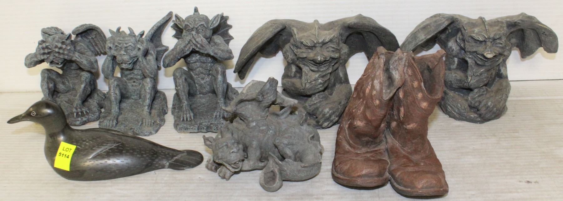 6 GARGOYLES, 1 BOOTS, 1 DUCK (ONE GARGOYLE IS MISSING ITS NOSE)