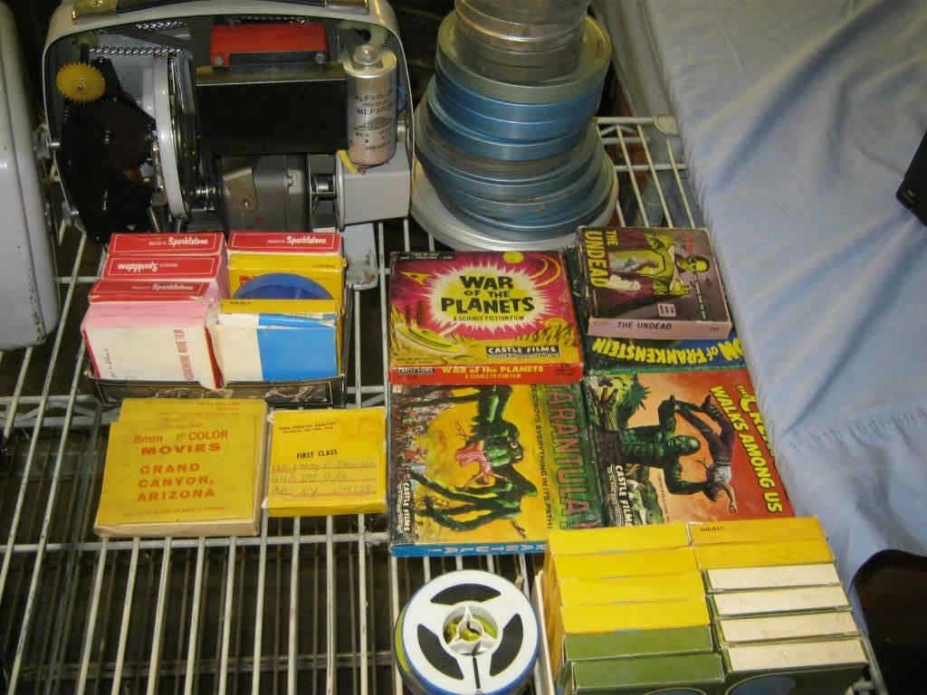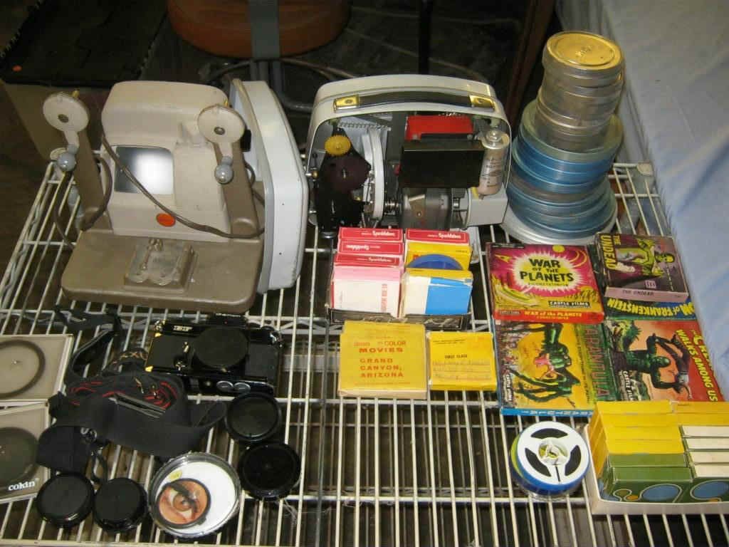 Movies- War of the Planet - The Creature Walks Among Us - Tarantula The Undead - Son of Frankenstein - has projector re-winder - vintage camera Cannon with lens's- vintage film box holders-