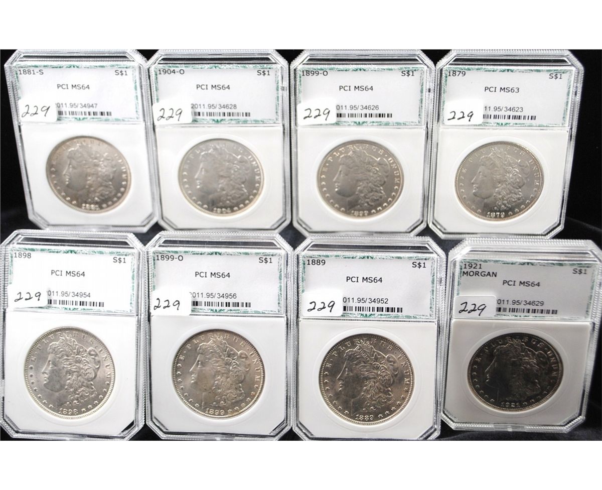 8 MORGAN DOLLARS - 1879, TWO 1899-0, 1904-0, 1921, 1881-S, 1898, 1889 - ALL PCI MS64 - SOLD PER CO