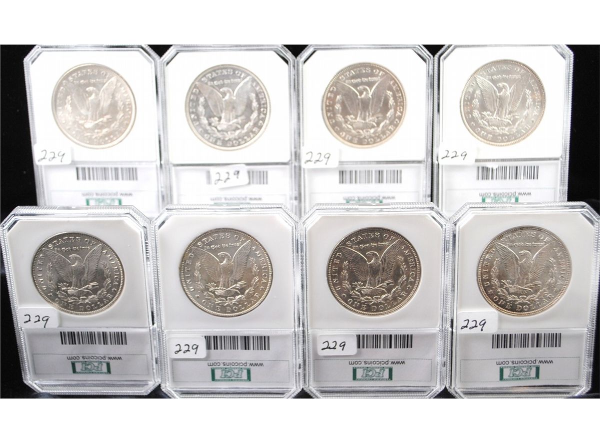 8 MORGAN DOLLARS - 1879, TWO 1899-0, 1904-0, 1921, 1881-S, 1898, 1889 - ALL PCI MS64 - SOLD PER COIN TIMES 8