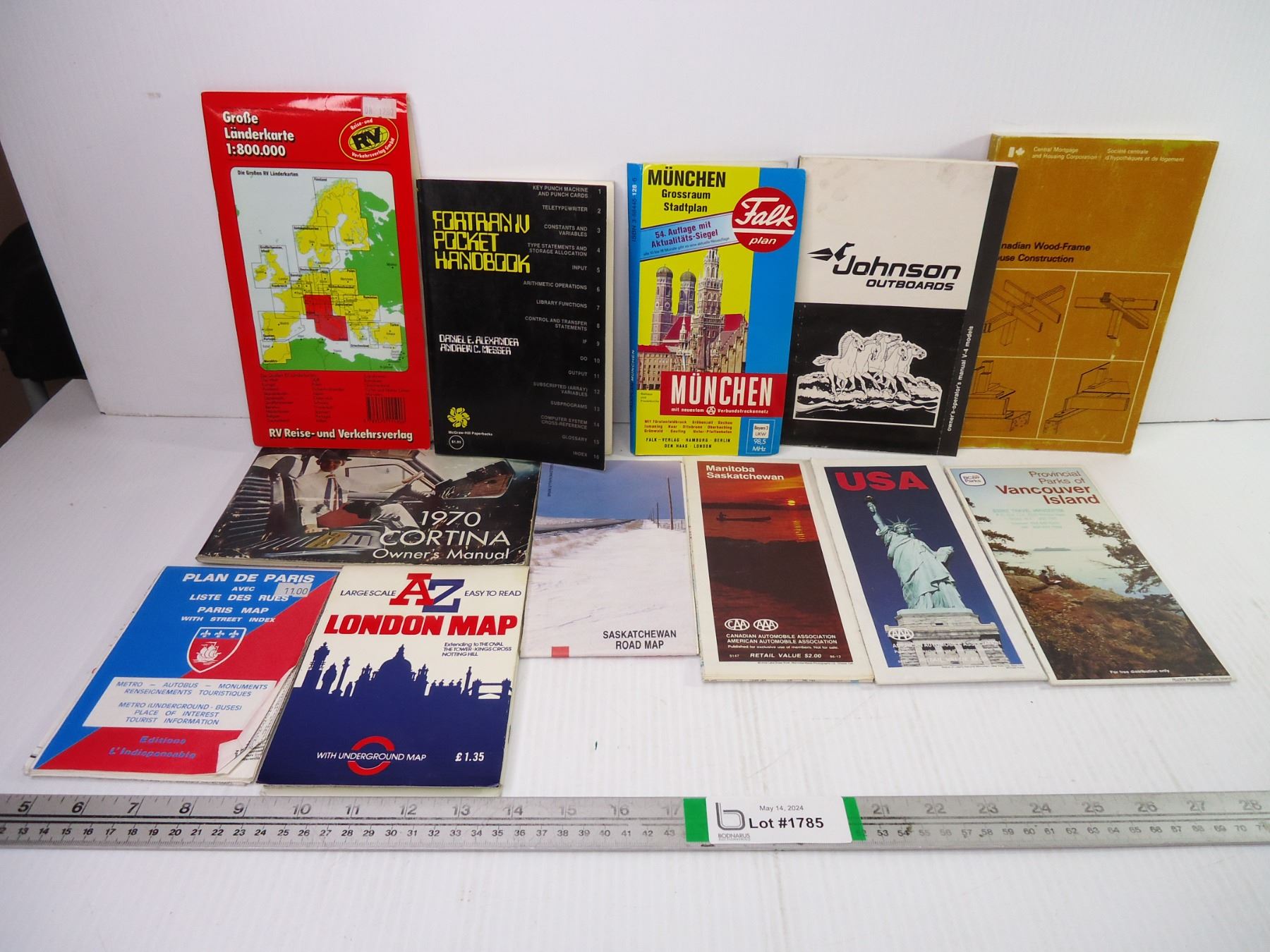 (8) Maps, Car Manual, Johnson Outboard Manual, Construction Book and Fortran IV Handbook