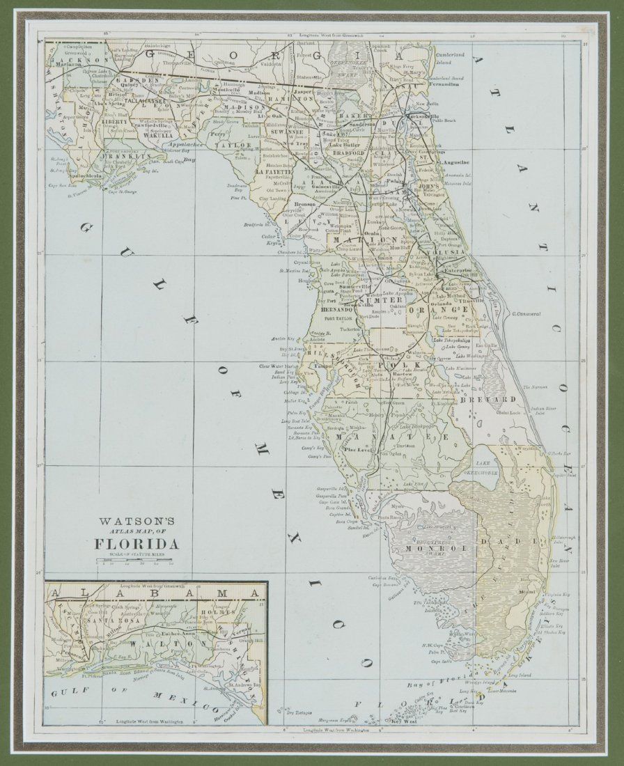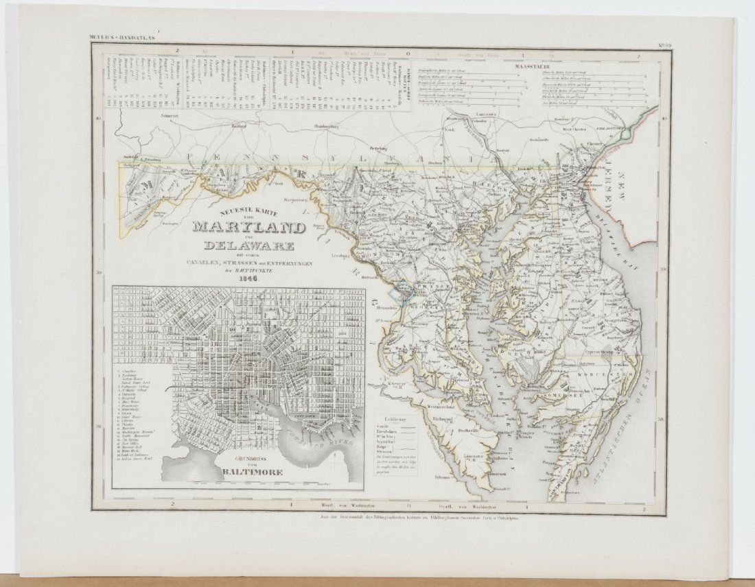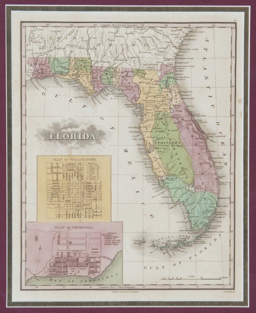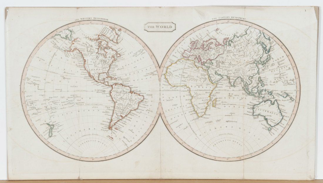 [Maryland/Florida/Hemispheres]. 8 Maps. Largest: 13 7/8? x 10 5/8?. Smallest: 8 1/8? x 10 3/8?. ++ The World. Hemisphere maps. [From ?A New Universal Atlas, Containing Distinct Maps of all the principal Kingdoms and States Throughout the World; Adapted for the use of Schools.? G. & J. Cary, ca. 1826.] Map number ?1? in margin at upper right. Trimmed nearly to plate mark, image side otherwise very good. Verso not examined. ++ Neueste Karte von Maryland und Delaware mit seinen Canaelen, Strassen und Entfernungen der Hauptpunkte. 1846. In lower margin: ?Aus der Graviranstalt des Bibliographischen Instituts zu Hildburghausen Amsterdam Paris u. Philadelphia.? From an edition of ?Myer?s Handatlas,? map ?No. 89? in margin at upper right. Detailed inset of downtown Baltimore. Prtd color outline. Image side very good. Verso not examined. ++ Florida. 1833. In margin at lower right: ?Young Sc.? In center of lower margin: ?A. Finley Philadelphia.? 2 Insets showing the city grids of what were then small towns: [1] Plan of Tallahassee. [2] Plan of Pensacola. Hand-colored. Dampstain in right margin, sight condition otherwise very good. ++ Colton?s Florida. NY: Johnson & Browning. (1855). Inset ?Plan of the Florida Keys.? Hand-colored. ++ Florida. Shows counties, townships, rivers, railroads, and some topographic features. (NY: Sidney E. Morse and Samuel Breese, 1842.) Inset: ?West Part of Florida.? ++ Watson?s Atlas Map, of Florida. [From an edition of ?Watson?s New and Complete Illustrated Atlas of the World,? NY: Watson/Tenney, ca. 1886]. Inset of western Florida. Printed color. ++ Florida. (Dodd, Mead & Company , 1891). From an edition of ?International Cyclopaedia.? Inset of southern Florida. Prtd. Color. 2 tears at upper left (marginal), sight condition otherwise near fine. ++ Florida. Chi: People?s Publishing Co., (nd), [ca. 1880?s ? 1910]. Inset ?North-Western Portion of Florida.? Prtd color outline.