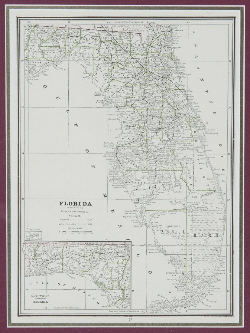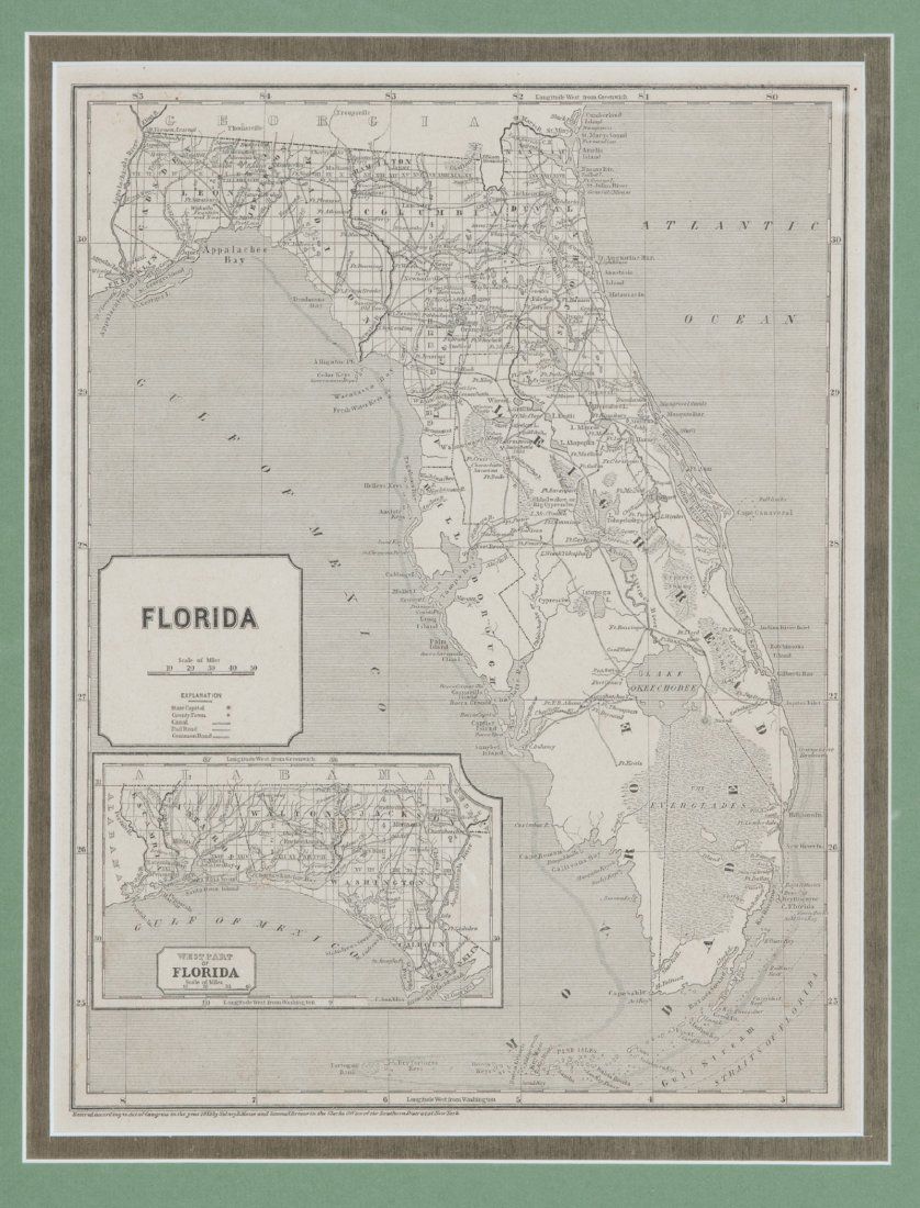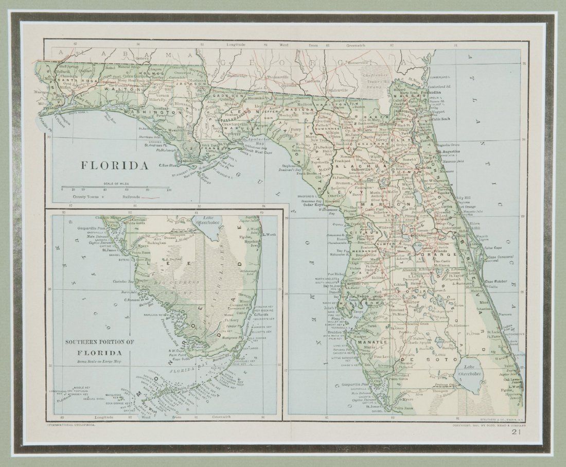 [Maryland/Florida/Hemispheres]. 8 Maps. Largest: 13 7/8? x 10 5/8?. Smallest: 8 1/8? x 10 3/8?. ++ The World. Hemisphere maps. [From ?A New Universal Atlas, Containing Distinct Maps of all the principal Kingdoms and States Throughout the World; Adapted for the use of Schools.? G. & J. Cary, ca. 1826.] Map number ?1? in margin at upper right. Trimmed nearly to plate mark, image side otherwise very good. Verso not examined. ++ Neueste Karte von Maryland und Delaware mit seinen Canaelen, Strassen und Entfernungen der Hauptpunkte. 1846. In lower margin: ?Aus der Graviranstalt des Bibliographischen Instituts zu Hildburghausen Amsterdam Paris u. Philadelphia.? From an edition of ?Myer?s Handatlas,? map ?No. 89? in margin at upper right. Detailed inset of downtown Baltimore. Prtd color outline. Image side very good. Verso not examined. ++ Florida. 1833. In margin at lower right: ?Young Sc.? In center of lower margin: ?A. Finley Philadelphia.? 2 Insets showing the city grids of what were then small towns: [1] Plan of Tallahassee. [2] Plan of Pensacola. Hand-colored. Dampstain in right margin, sight condition otherwise very good. ++ Colton?s Florida. NY: Johnson & Browning. (1855). Inset ?Plan of the Florida Keys.? Hand-colored. ++ Florida. Shows counties, townships, rivers, railroads, and some topographic features. (NY: Sidney E. Morse and Samuel Breese, 1842.) Inset: ?West Part of Florida.? ++ Watson?s Atlas Map, of Florida. [From an edition of ?Watson?s New and Complete Illustrated Atlas of the World,? NY: Watson/Tenney, ca. 1886]. Inset of western Florida. Printed color. ++ Florida. (Dodd, Mead & Company , 1891). From an edition of ?International Cyclopaedia.? Inset of southern Florida. Prtd. Color. 2 tears at upper left (marginal), sight condition otherwise near fine. ++ Florida. Chi: People?s Publishing Co., (nd), [ca. 1880?s ? 1910]. Inset ?North-Western Portion of Florida.? Prtd color outline.