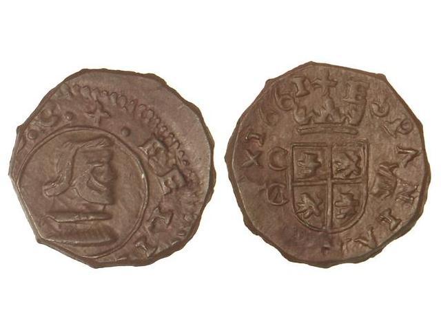 8 Maravedís. 1661. CUENCA. Anv.: FELIP... Rev.: ESPANIAR(VM). Escudo entre C/CA y VIII. Acuñada a martillo. (Anverso algo descentrado). RARÍSIMA y NO RESEÑADA. Cal-No cat. EBC-.
