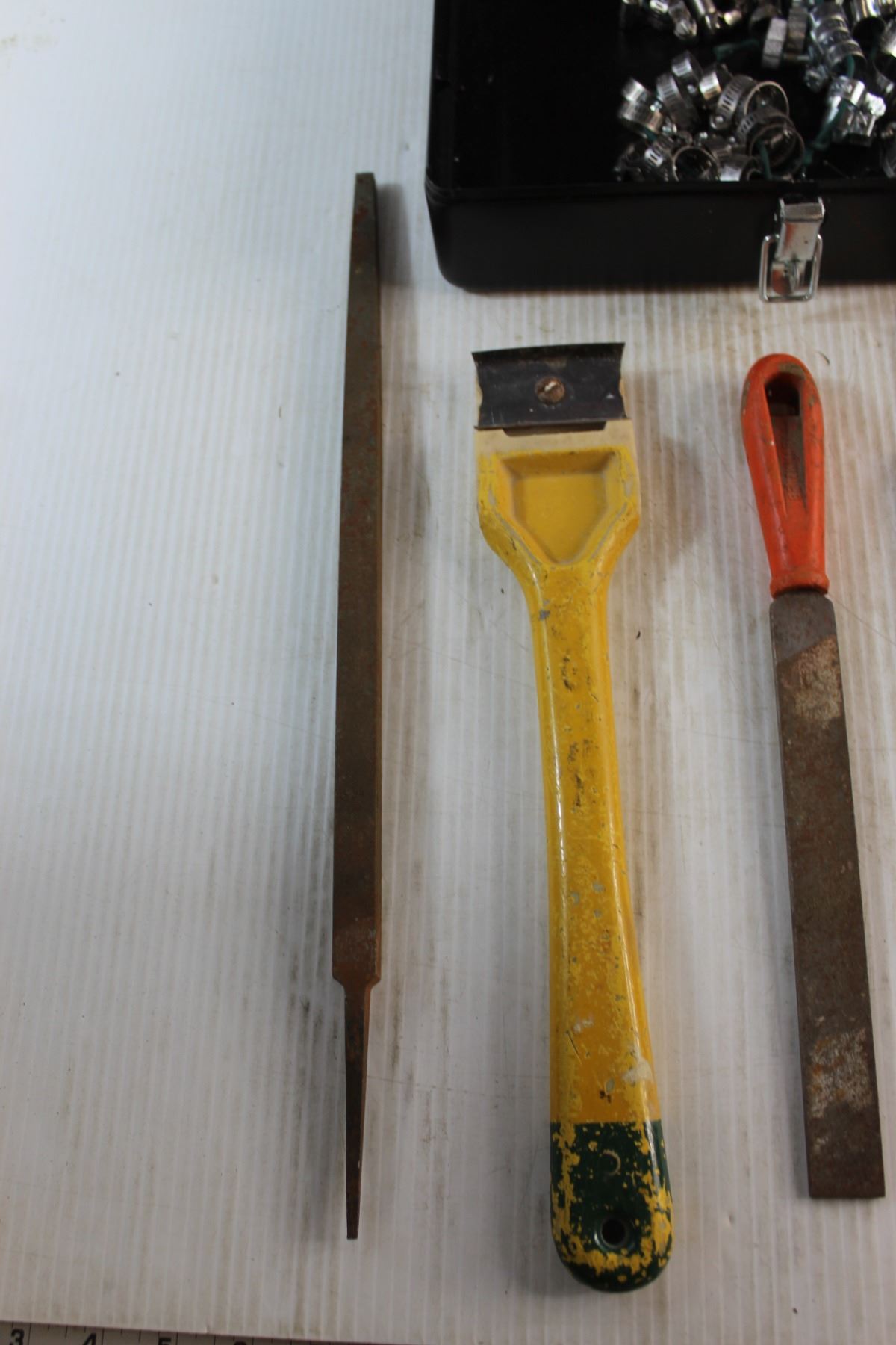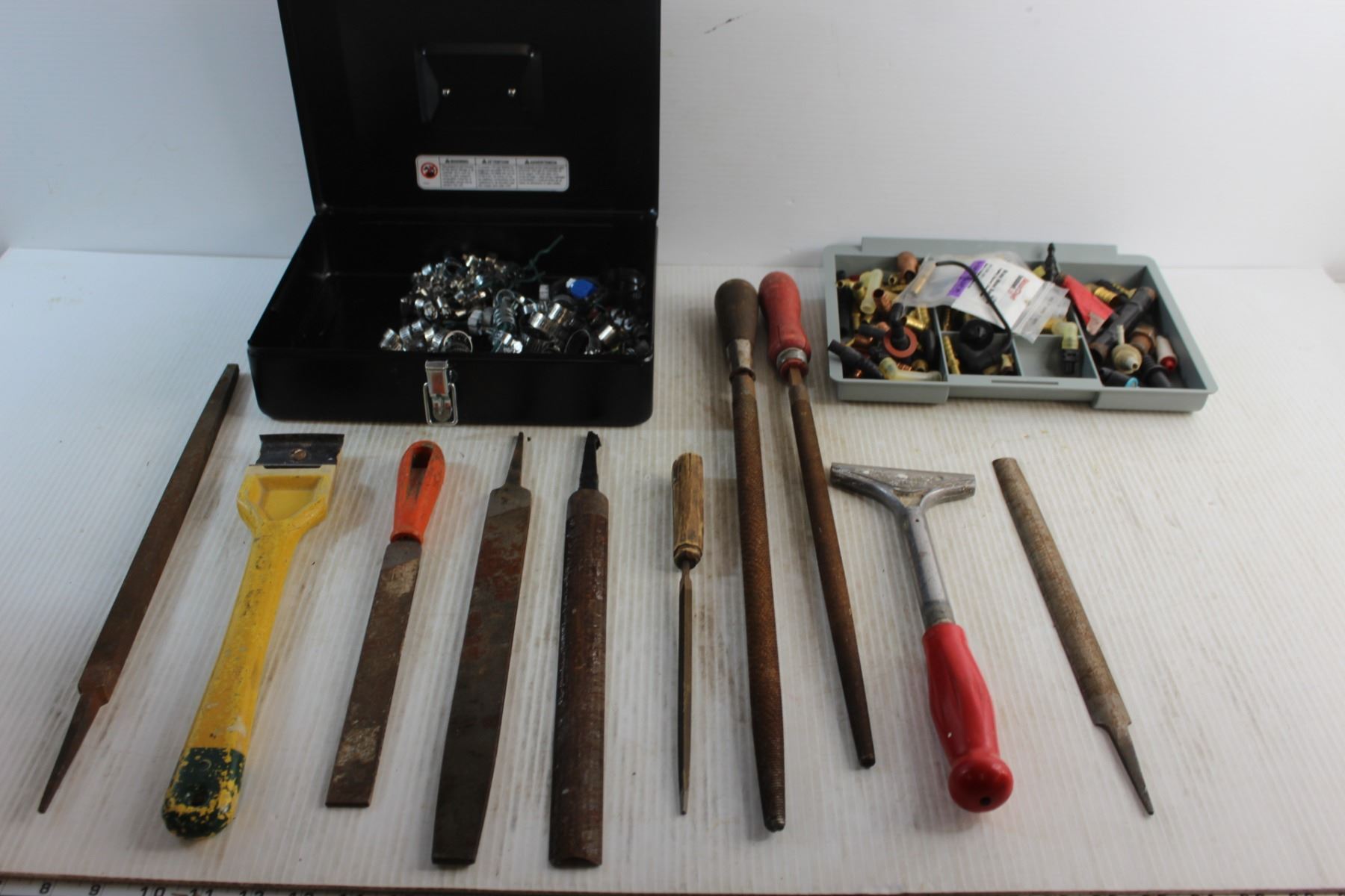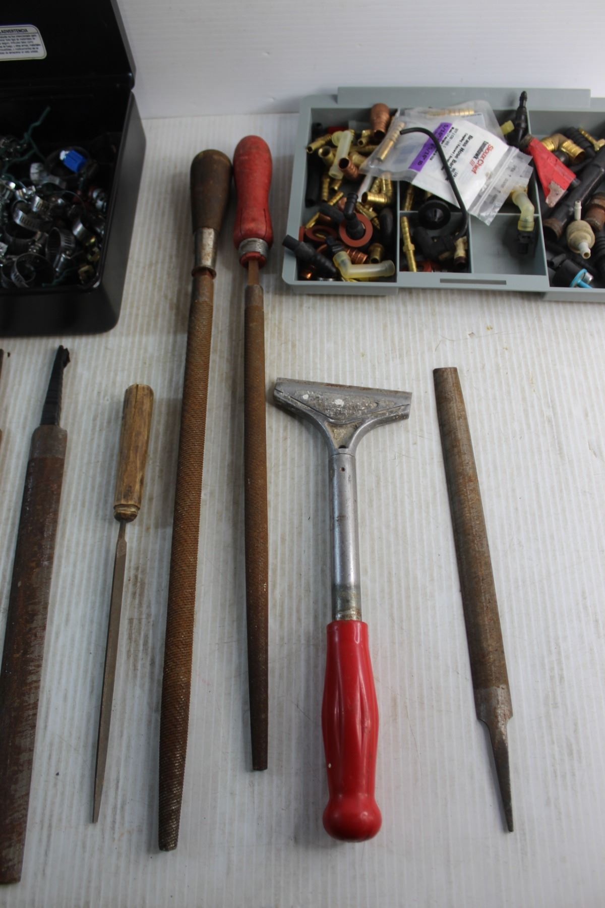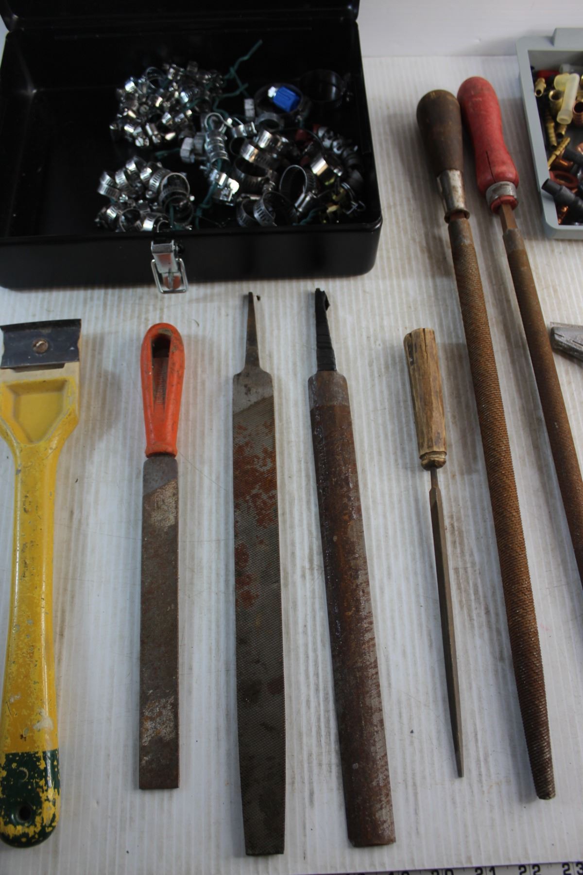 (8) Metal Files, (2) Scrapers and Hose Clamps, Hose Barbs & Small Parts Box