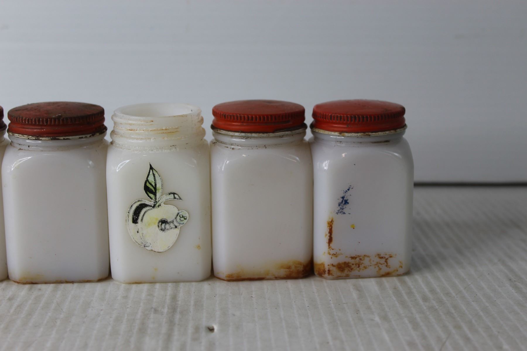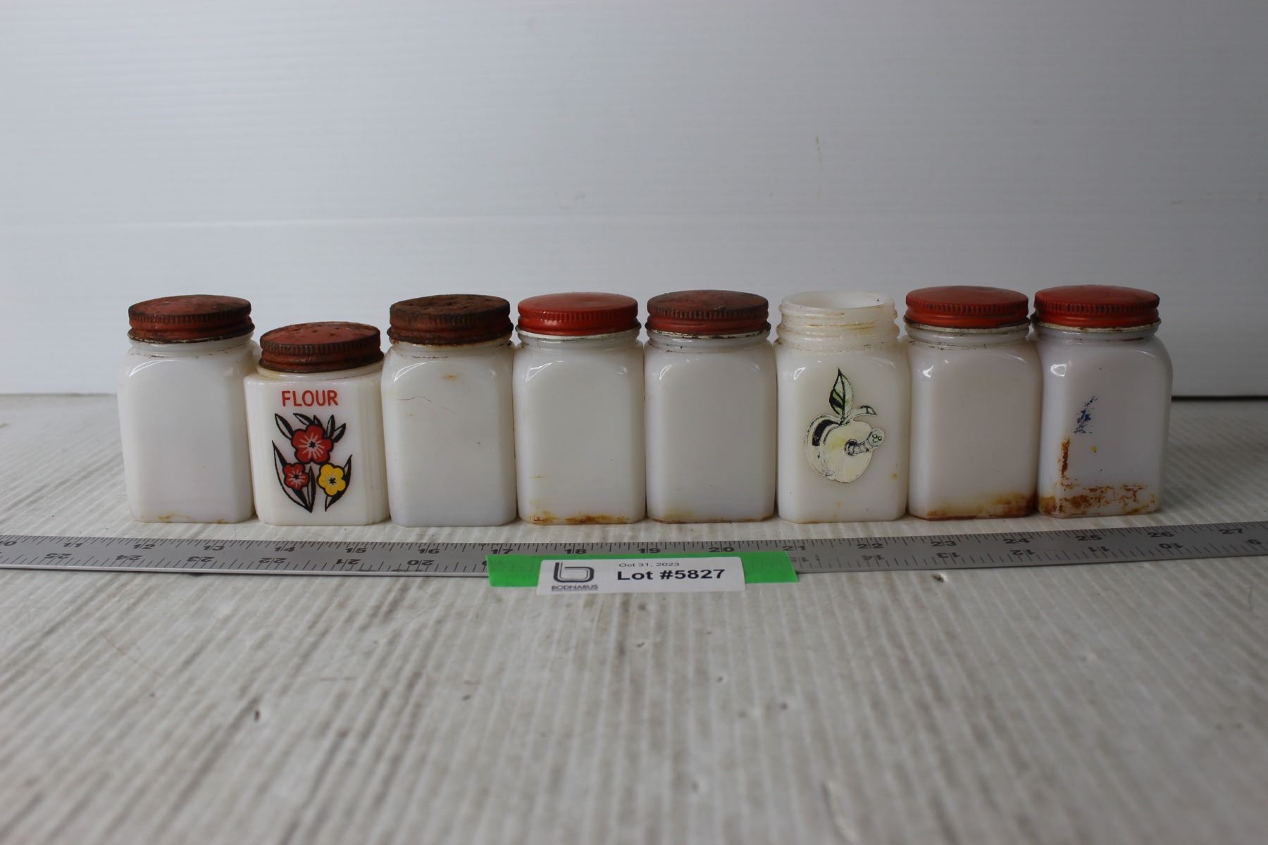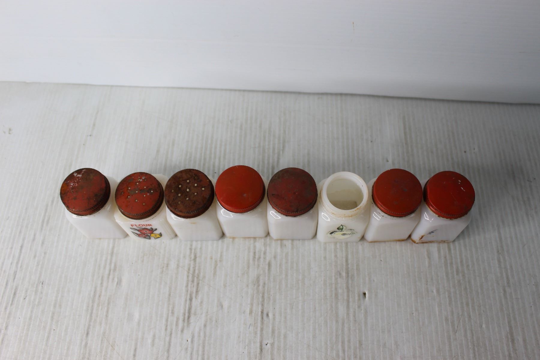 (8) Milk Glass Spice Jars and Salt and Pepper Shakers