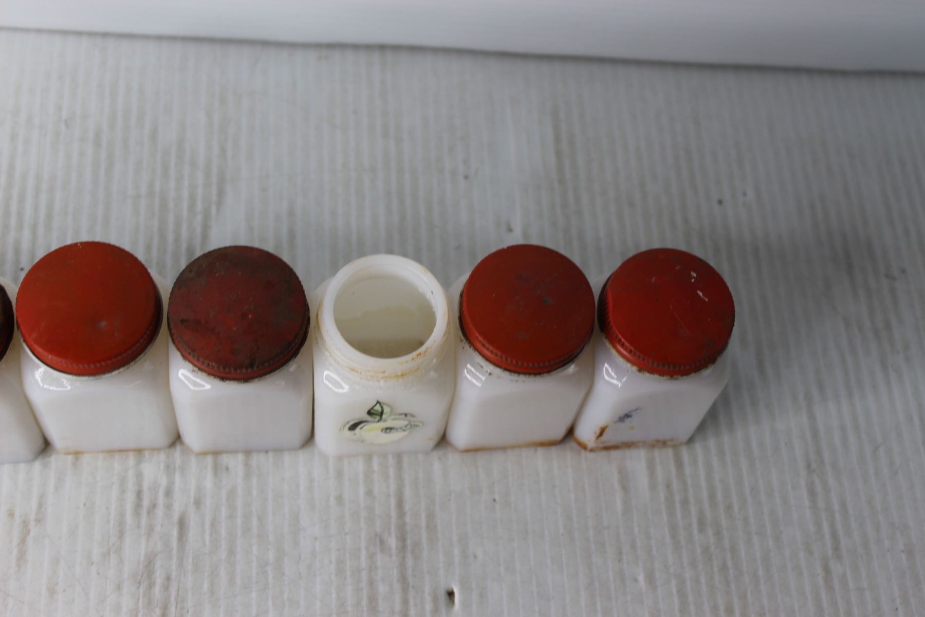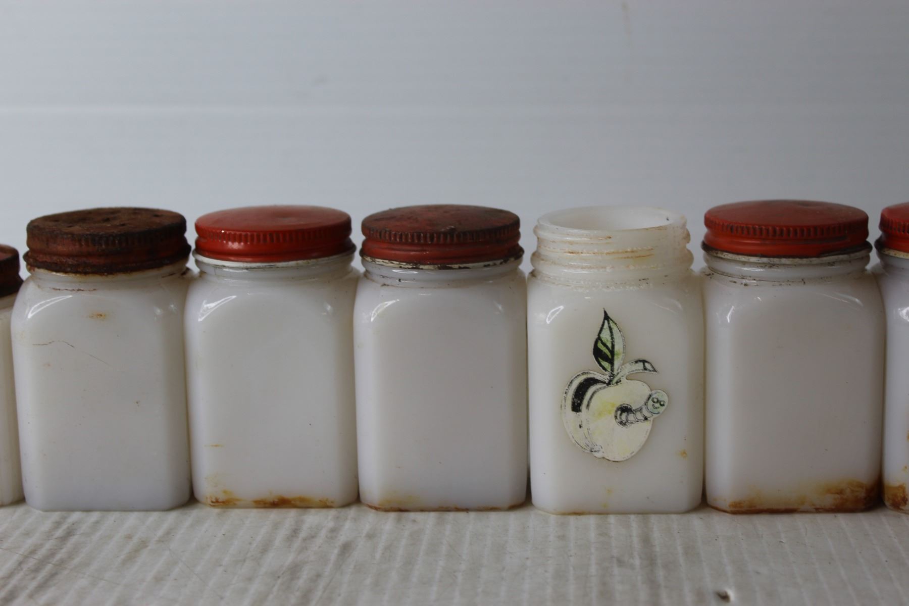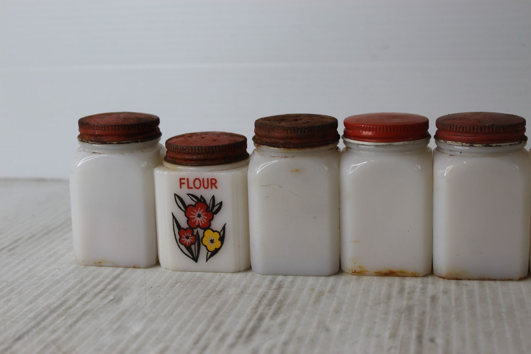 (8) Milk Glass Spice Jars and Salt and Pepper Shakers