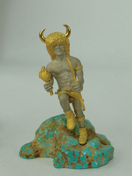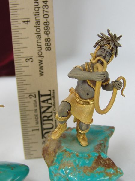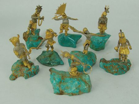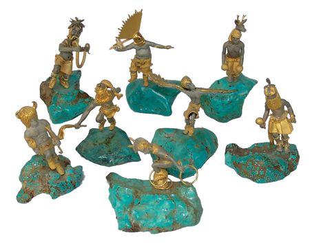 Ca. 1975, Each limited edition piece cast in silver with gold plated accents on huge turquoise bases. From the Southwestern Indian Series from 1975, which includes: The buffalo, deer, eagle, snake, hoop, Gan, Zuni rain, and Yei Bi Chei Dancers. All in very good condition. The turquoise is beautiful. Largest approx. 3" x 3" x 1-1/2"