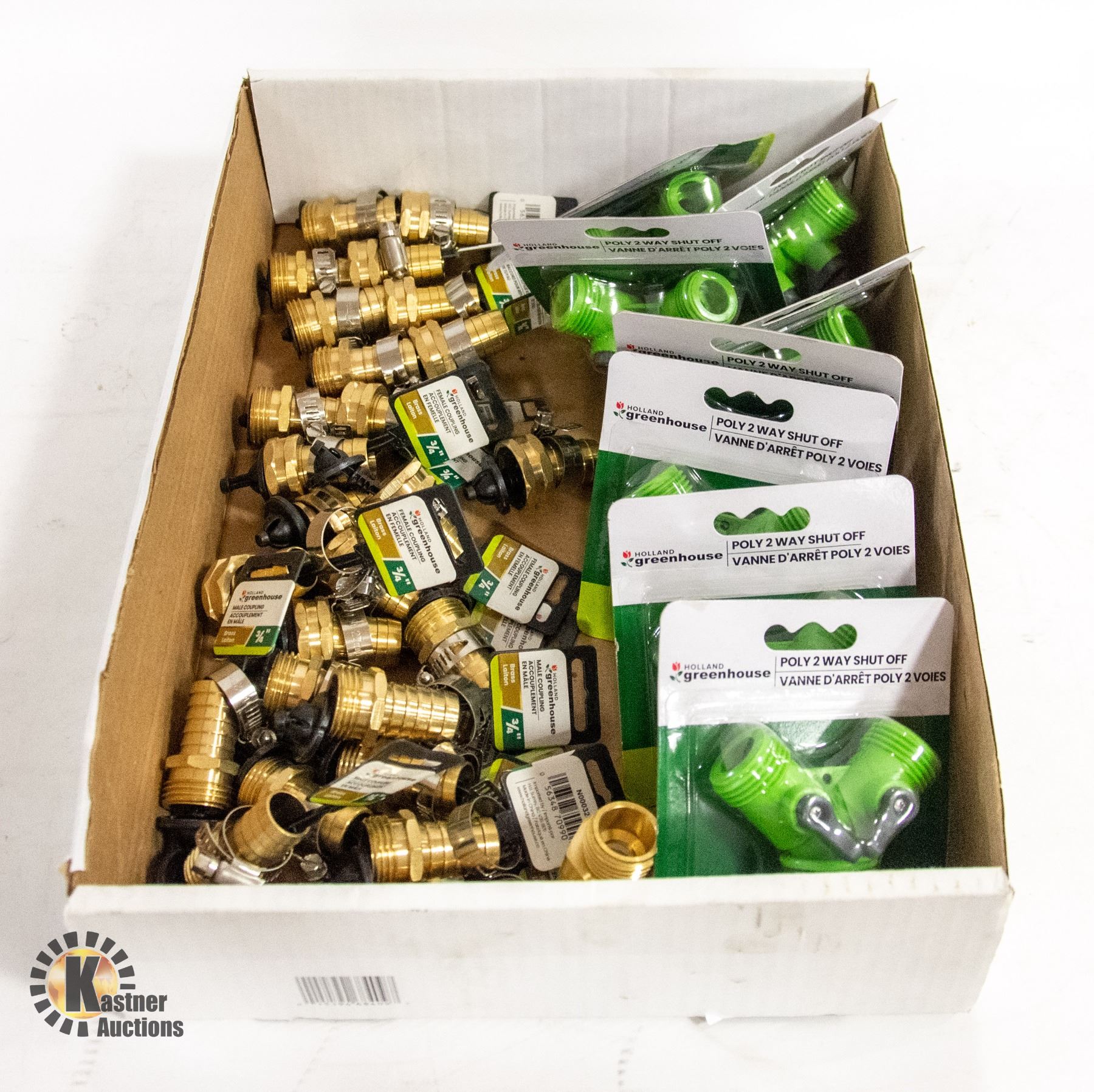 OFFS + 5 NEW 3/4" BRASS COUPLING REPAIR KITS + 7 NEW 3/4" BRASS FEMALE COUPLINGS + 10 NEW MALE BRASS COUPLINGS + EXTRA BRASS VALVE (UNKNOWN PART NUMBER ON THIS ONE VALVE) **ALL ITEMS MUST BE REMOVED BY 5PM SATURDAY, JANUARY 20TH 2024. ALL REMAINING ITEMS WILL BE SUBJECT TO A $6.00 PER DAY STORAGE CHARGE. ANY ITEMS REMAINING AFTER MONDAY, FEBRUARY 5TH, 2024 WILL BE CONSIDERED FORFEITED. NO REFUNDS WILL BE ISSUED FOR FORFEITED ITEMS. TO SCHEDULE A PICK UP APPOINTMENT CLICK HERE