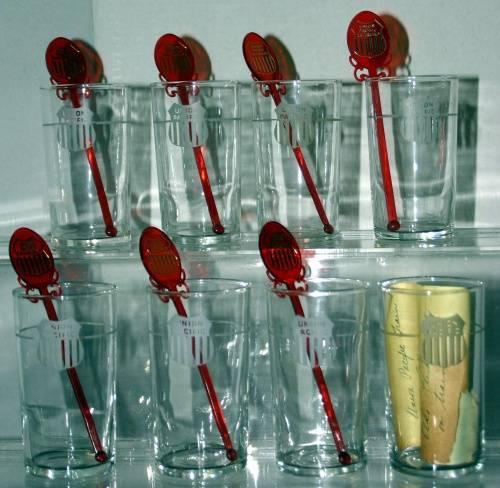 8 ORIGINAL UNION PACIFIC RR HI-BALL GLASSES WITH 7 U.P. RED PLASTIC SWIZZLE STICKS. PAPER IN ONE OF THE GLASSES STATES "UNION PACIFIC TRAIN LAST TRIP FEBRUARY 1970 ELKS CLUB PARTY ON TRAIN"