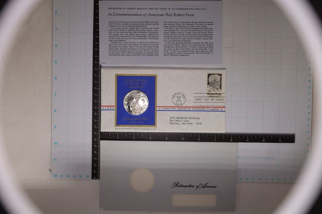 OF AMERICAN POET ROBERT FROST, LIMITED EDITION, POSTMASTERS OF AMERICA WITH INFO CARD