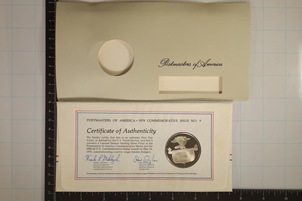 COMMEMORATIVE OF COUNTRY SINGER JIMMIE RODGERS, POST MASTERS OF AMERICA WITH INFO CARD