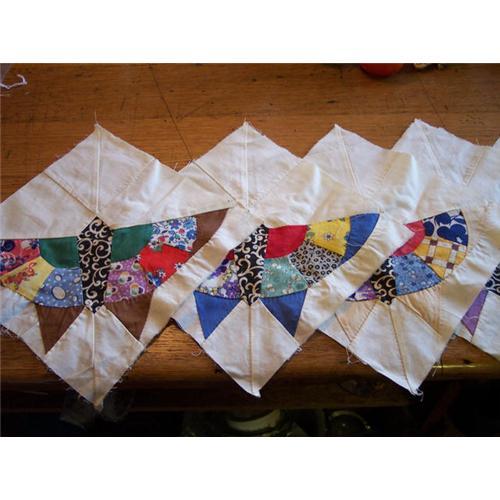 Very nice colors in these quilt blocks.I believe the pattern is Oriental Butterfly,but not positive.All hand stitched.One has some marks on the edge,but this may come out or would not show if you make it into a small quilt as the end would be turned over.Measure 9 3/4x10.All cotton material.