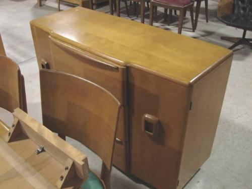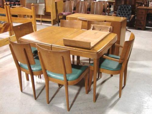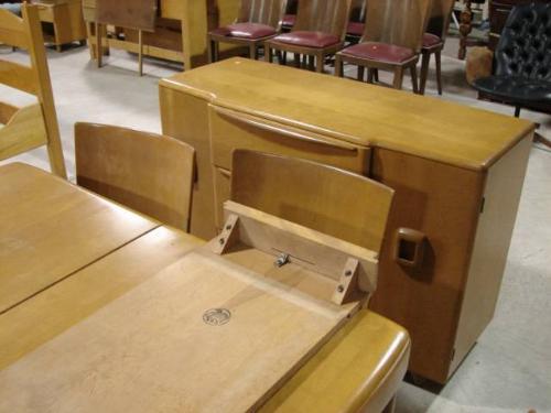 8 PIECE HEYWOOD WAKEFIELD DINING ROOM SUITE. Champagne color. Consists of 6 chairs (33" H to top of back, 18.5" H to top of seat, 18" W), dining table (29.75" H, 49.5" L, 33.5" W) with leaf (14.25" W), sideboard with three drawers and two doors (32.25" H, 47.5" W, 19" D).