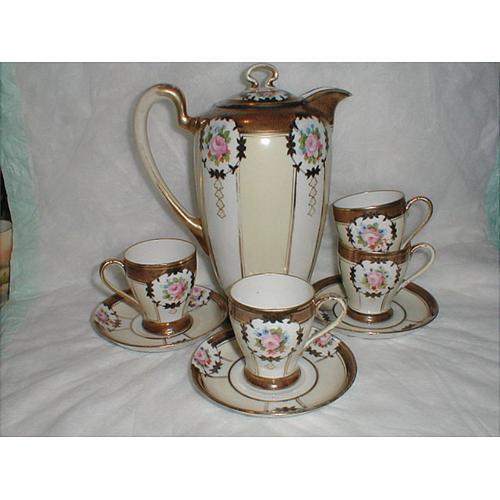 HERE IS A LOVELY 8 PIECE CHOCOLATE POT SET BY NIPPON THAT WAS PRODUCED AROUND 1911. THE CHOCOLATE POT MEASURES 9 IN. TALL WITH THE COVER ON AND 7 1/2 IN. WIDE FROM SPOUT TO HANDLE. EACH CUP MEASURES 2 3/4 IN. TALL AND 2 1/2 IN. IN DIAMETER AND EACH SAUCER MEASURES 4 3/4 IN. IN DIAMETER.<P>