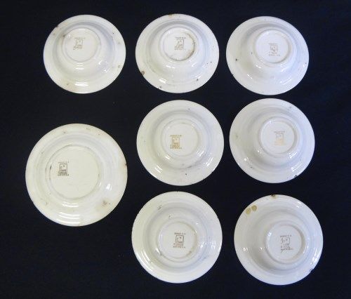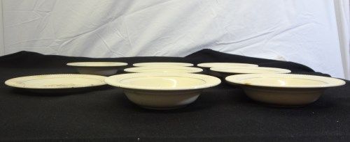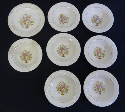 1 6 1/2" PLATE WITH 7 MATCHING 5 1/2" BOWLS. HAS A BASKET WITH FLOWERS DESIGN. MARKING SAYS BASKET P.P. BY SALEM CHINA CO. MADE IN U.S.A. SOME ARE CHIPPED AND STAINED.
