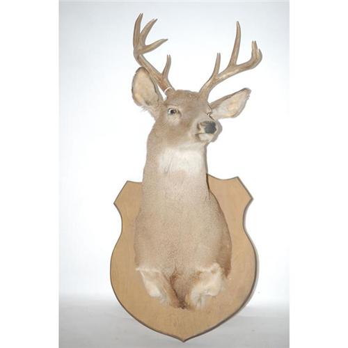 8 POINT WHITETAIL DEER MOUNT - TAXIDERMY PREPARED SHOULDER MOUNT ON SHIELD SHAPED PLAQUE (13 1/2" ANTLER SPREAD, APPROX. 18" X 38" OVERALL SIZE) - WEAR, SOILING, IMPERFECTIONS