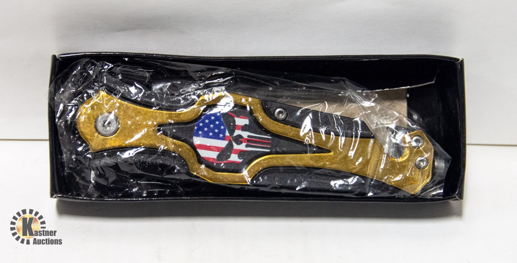 8  PUNISHER GOLDTONED FOLDING KNIFE