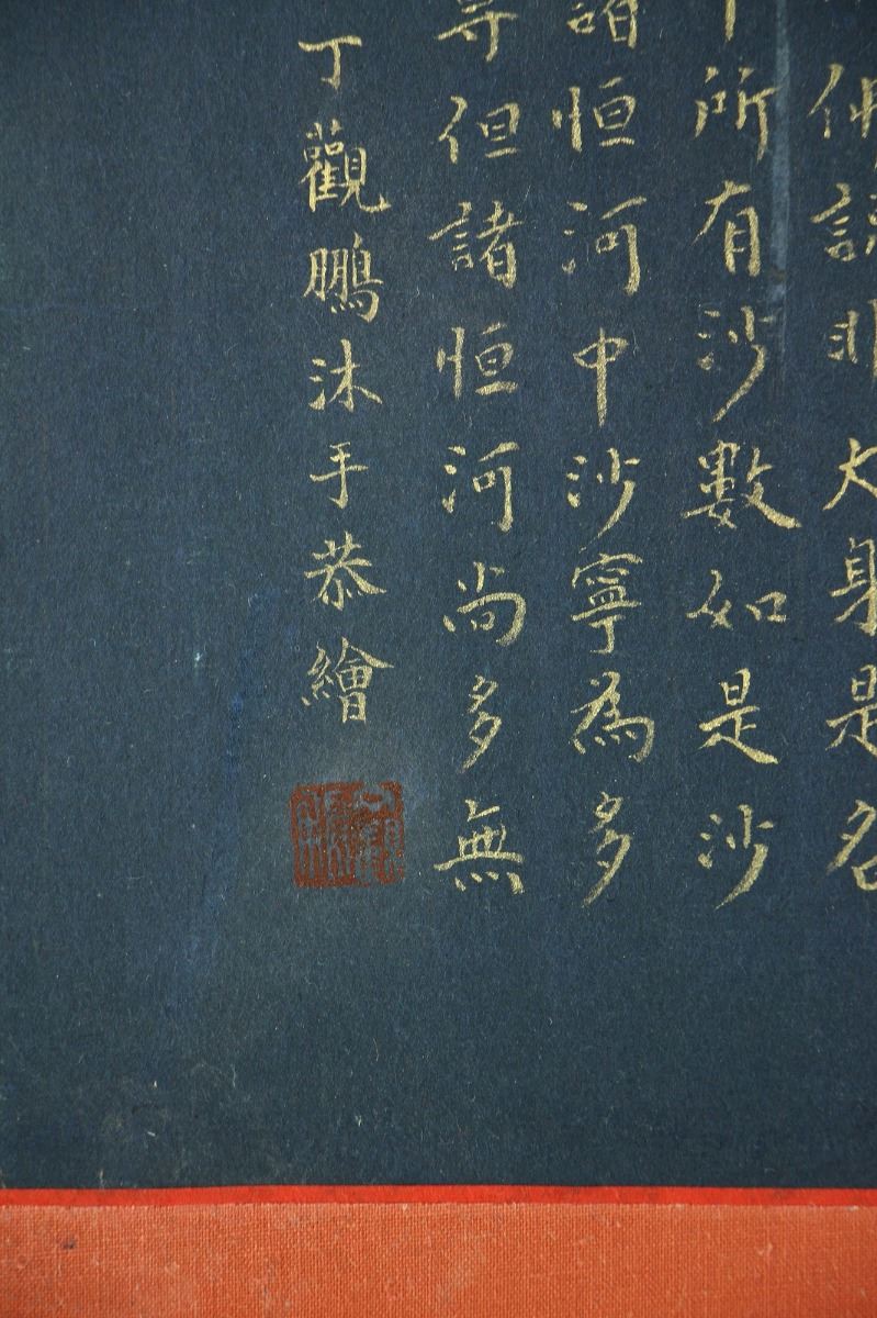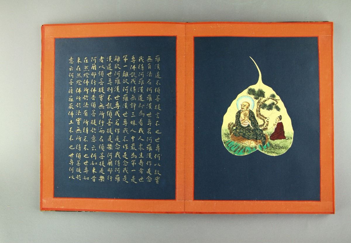 Arhat figures and Sutra script calligraphy; Chinese gilt ink and watercolour on paper; eight-page booklet; signed Ding Guanpeng and inscribed with one artist seal on the last page; 30 cm × 23 cm × 8 cm