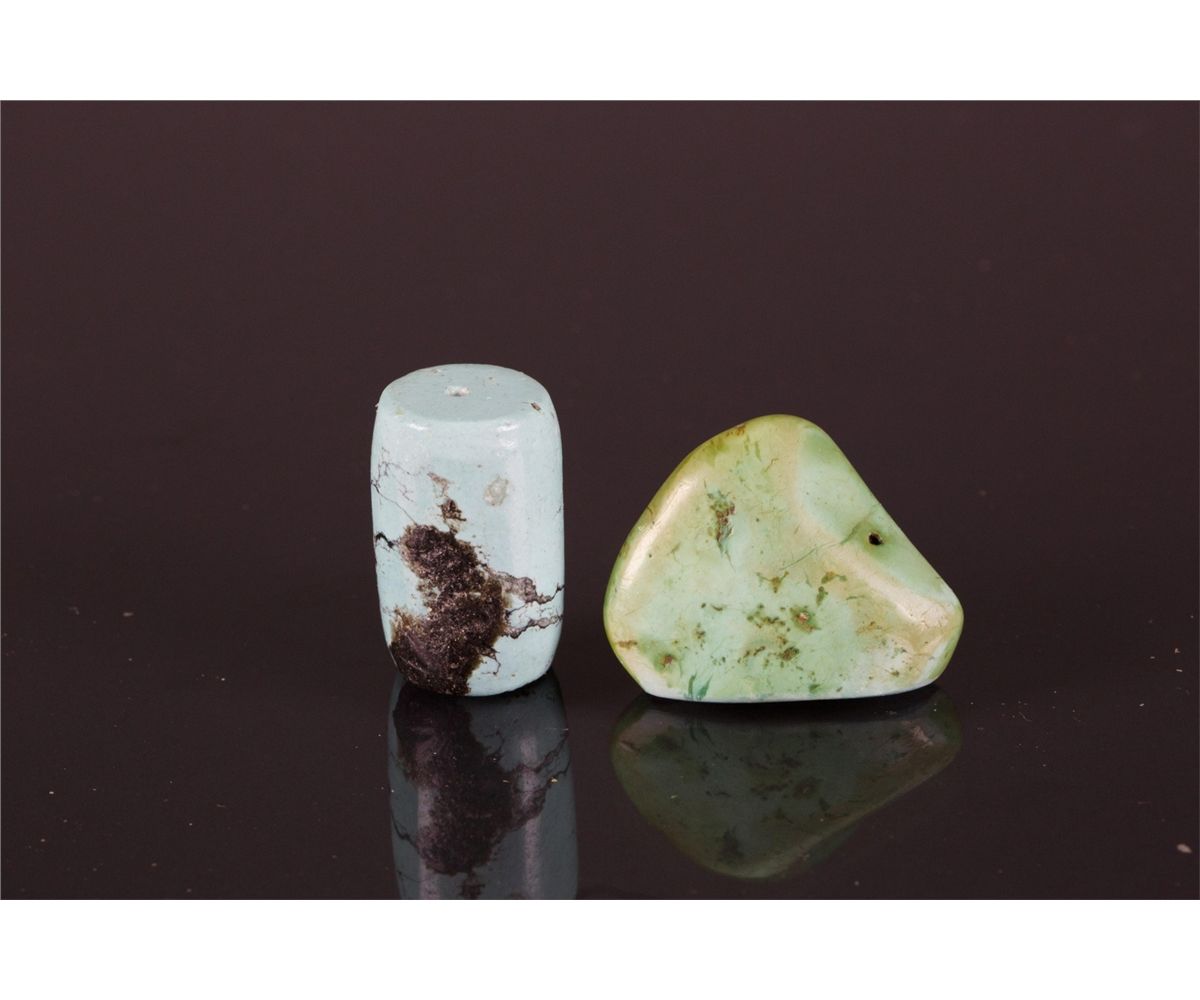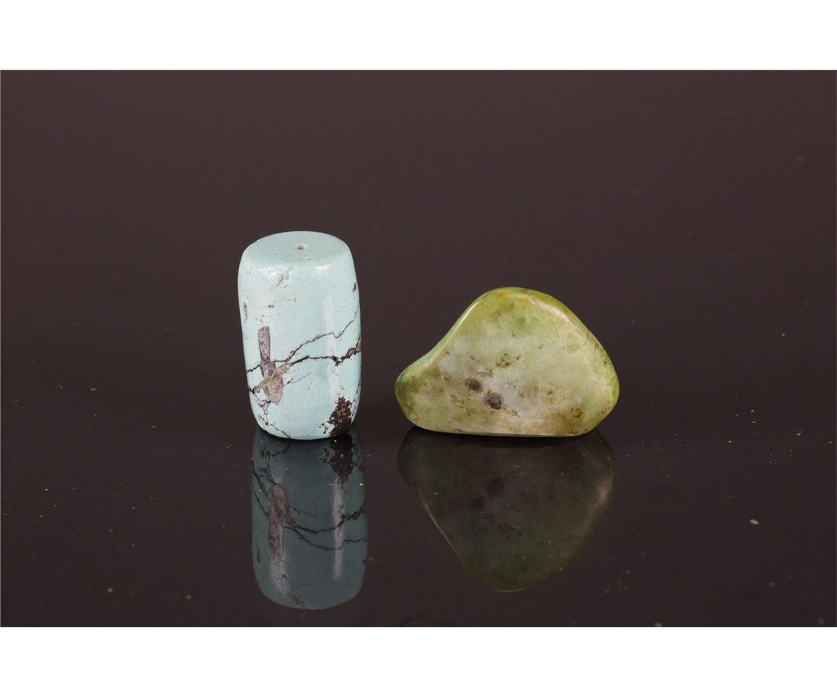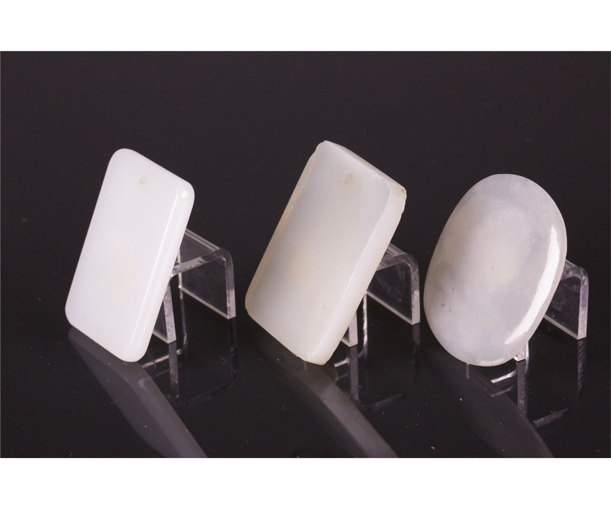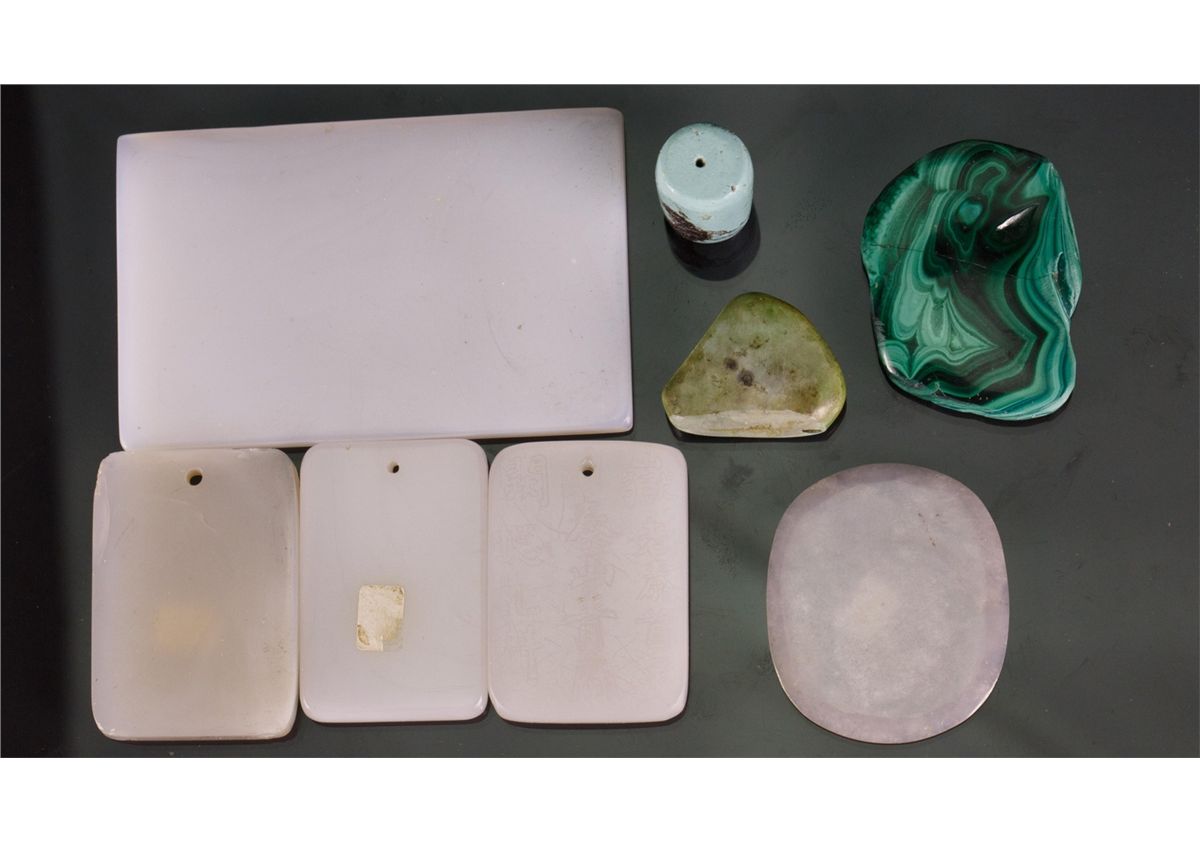 Eight pieces of Chinese varieties hardstone pendants; comprised of five square and oval white plaque and three turquoise pebbles; H: 11 cm, W: 7 cm, 298 grams