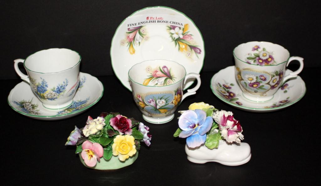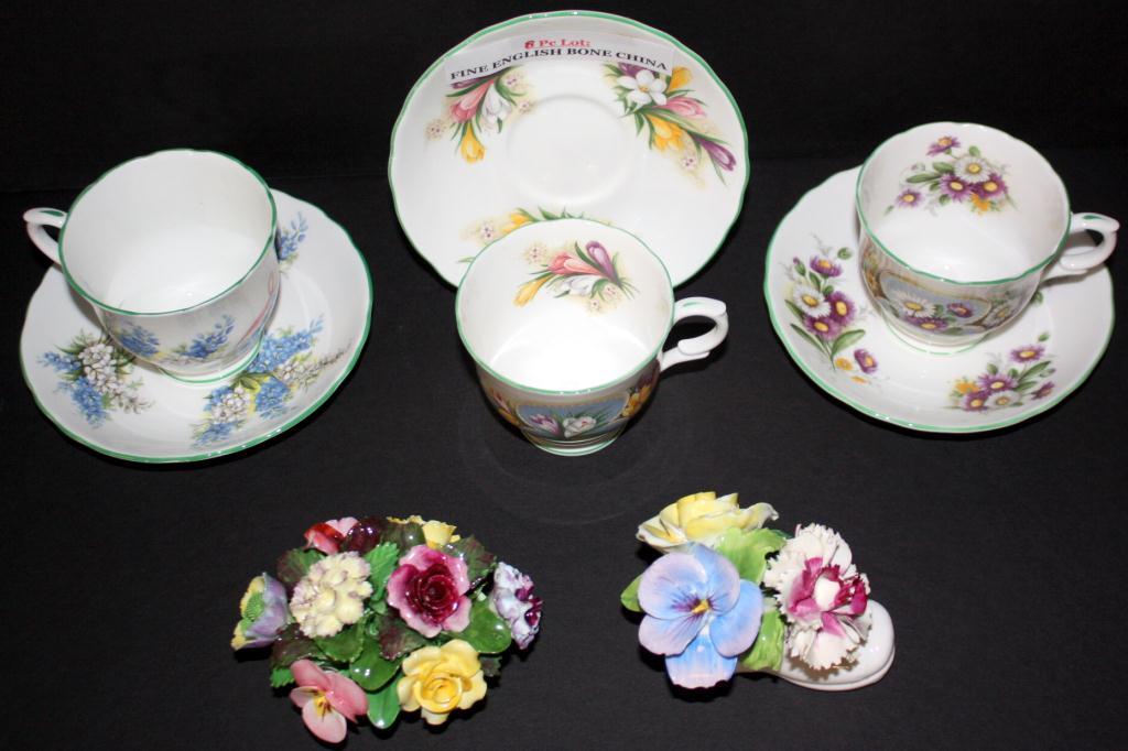 3 Staffordshire cups and Saucers 2 Denton, Staffordshire Floral Bouquets