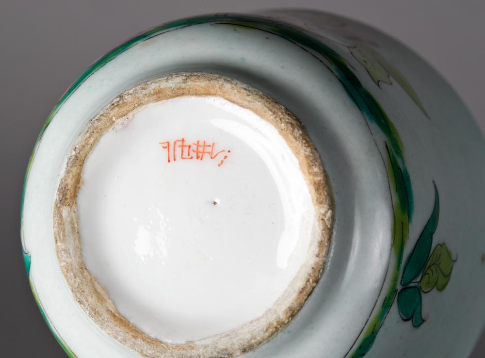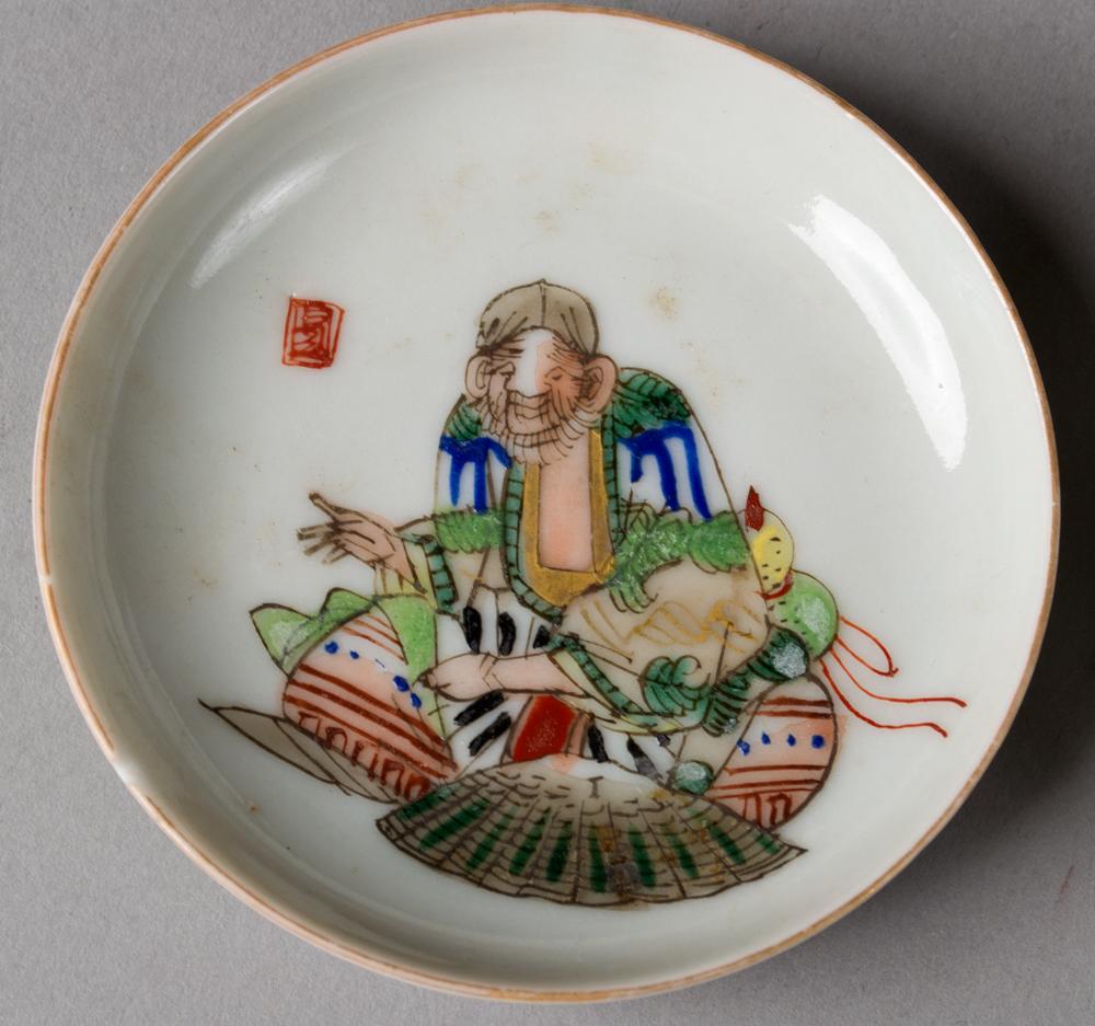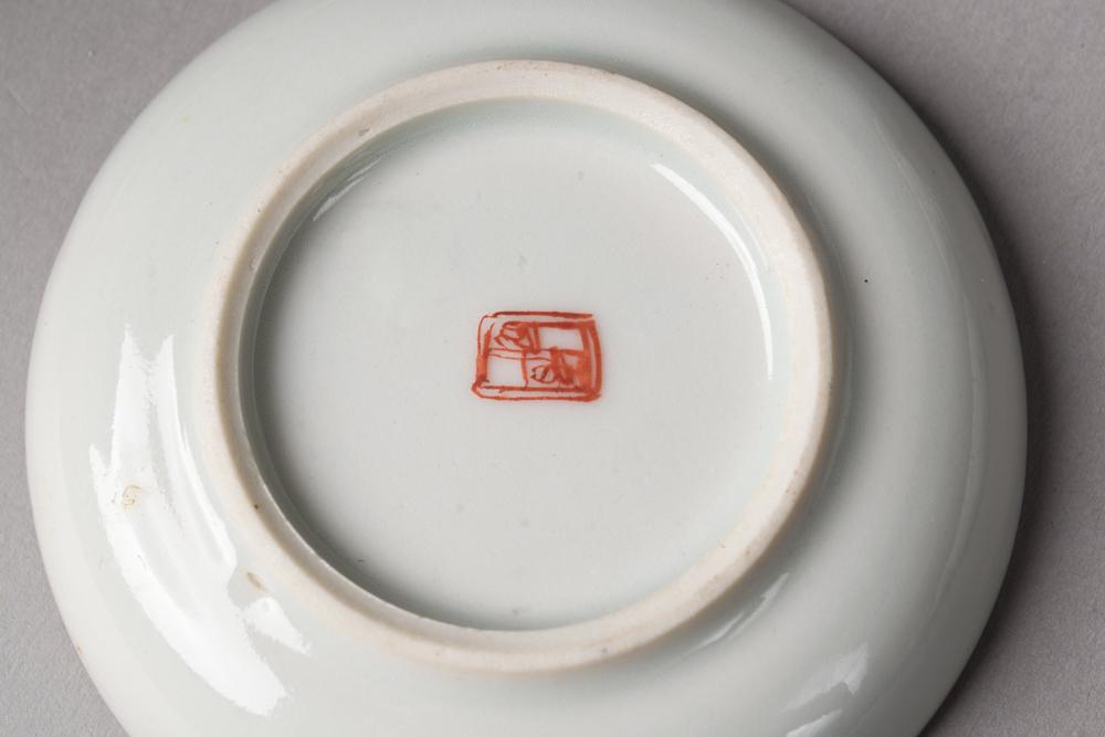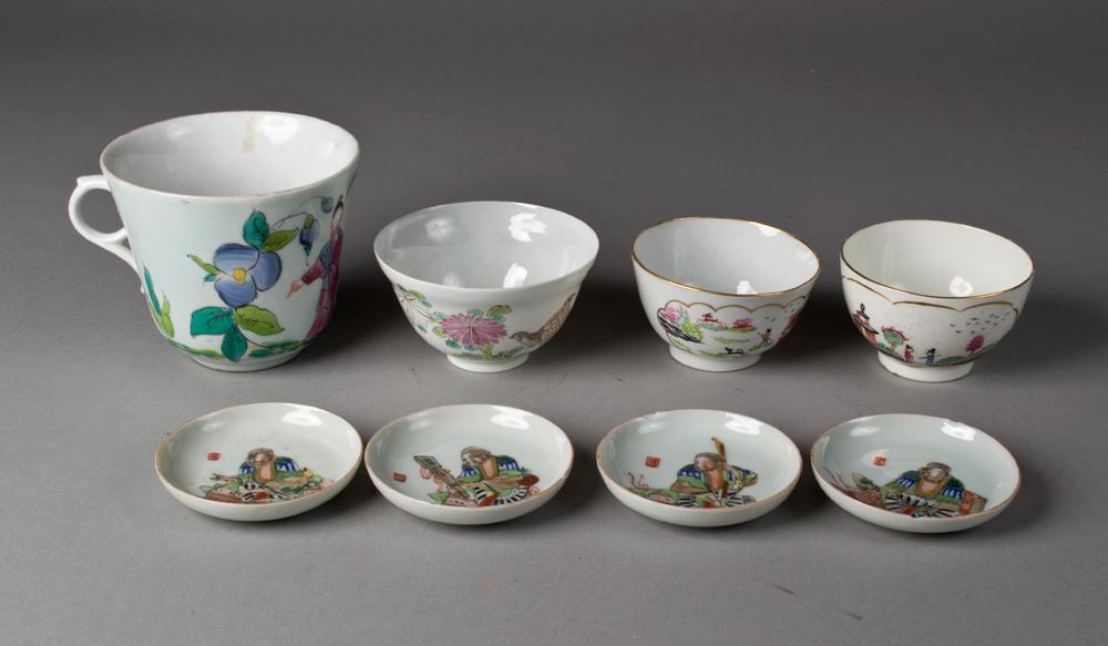 To include a large handled cup painted to depict a figures within a landscape, four small saucers enameled to depict figures with seal mark upper left and within foot rim, two small cups decorated to depict figures within a landscape on both sides, together with an eggshell this porcelain cup decorated with partridge lotus, and cherry blossoms with seal mark to base, largest is 3.625"H all circa early 20th century.