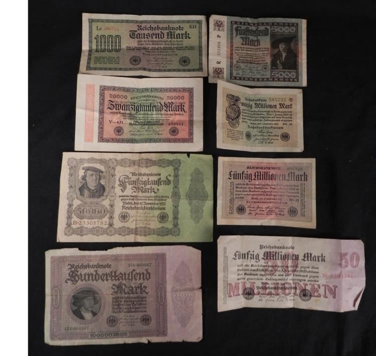 Up for auction are 8 Different amounts of German Paper Money from 1000 to 50 million marks, dated 1922 and 1923.