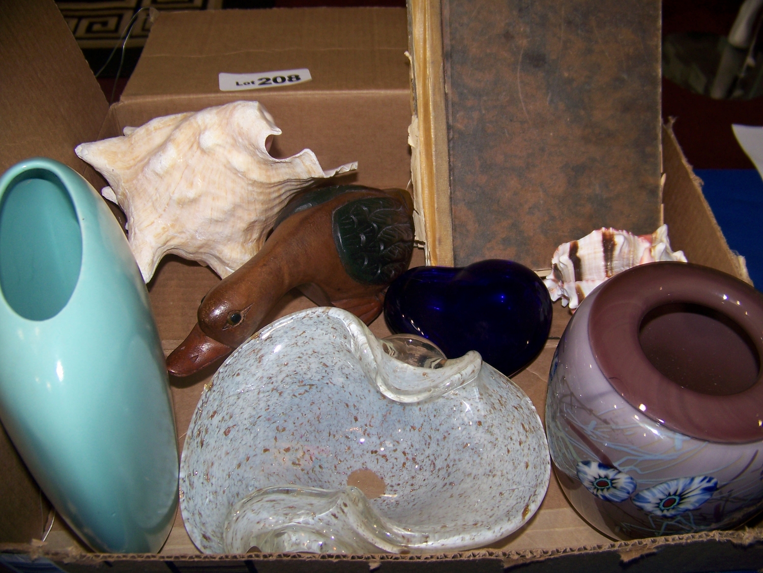 (8) Pi. Misc. Box lot containing antique book,(2) art glass (2) shells, duck as shown