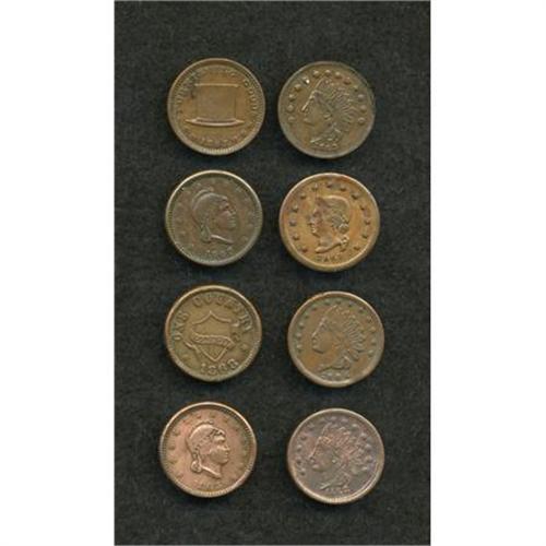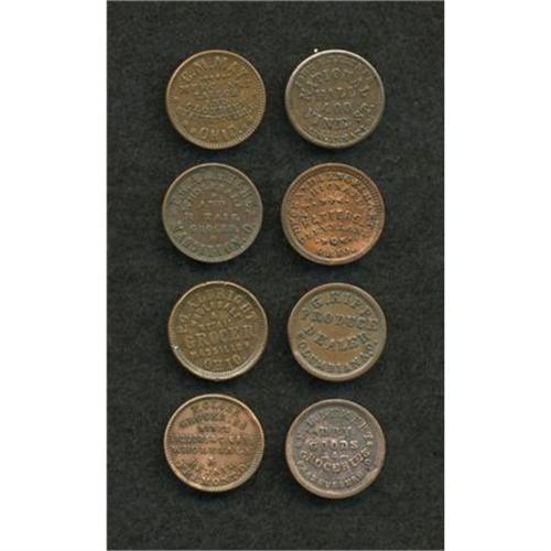 <B>8-Piece Ohio Civil War Merchant Token Group.</B></I> Eight tokens all from the state of Ohio, <B>Fuld-OH165GY-28a, R.8; OH175E-1a, R.3; OH190B-2a, R.6; OH310A-1a, R.6; OH330A-1a, R.4; OH535A-1a, R.4; OH535A-3a, R.2;</B></I> and <B>OH835E-2a, R.2.</B></I> This nice lot should command the attention of Ohio token collectors.<BR><BR><b>Shipping:</b> Coins & Currency (<a target="_blank" href="http://www.heritageauctions.com/common/shipping.php">view shipping information</a>)