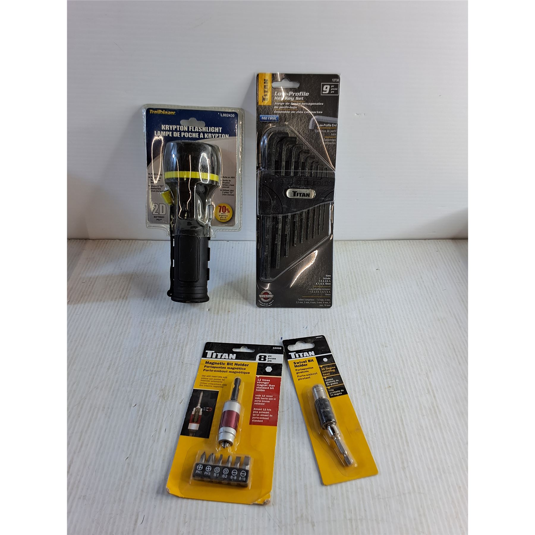 8 Piece Screw Extractor Set, Krypton Flashlight, Titan 9 Piece Hex Key Set, (2) Titan Bit Holders, E