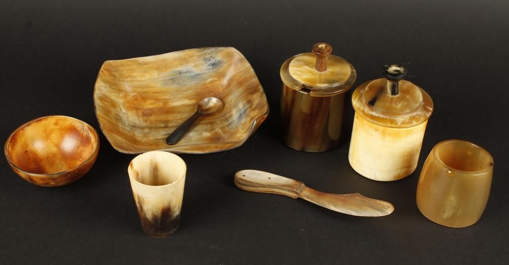 Circa 1920's. Includes: knife, spoon, bowl, (2) lidded canisters, (2) cups, and small dish.