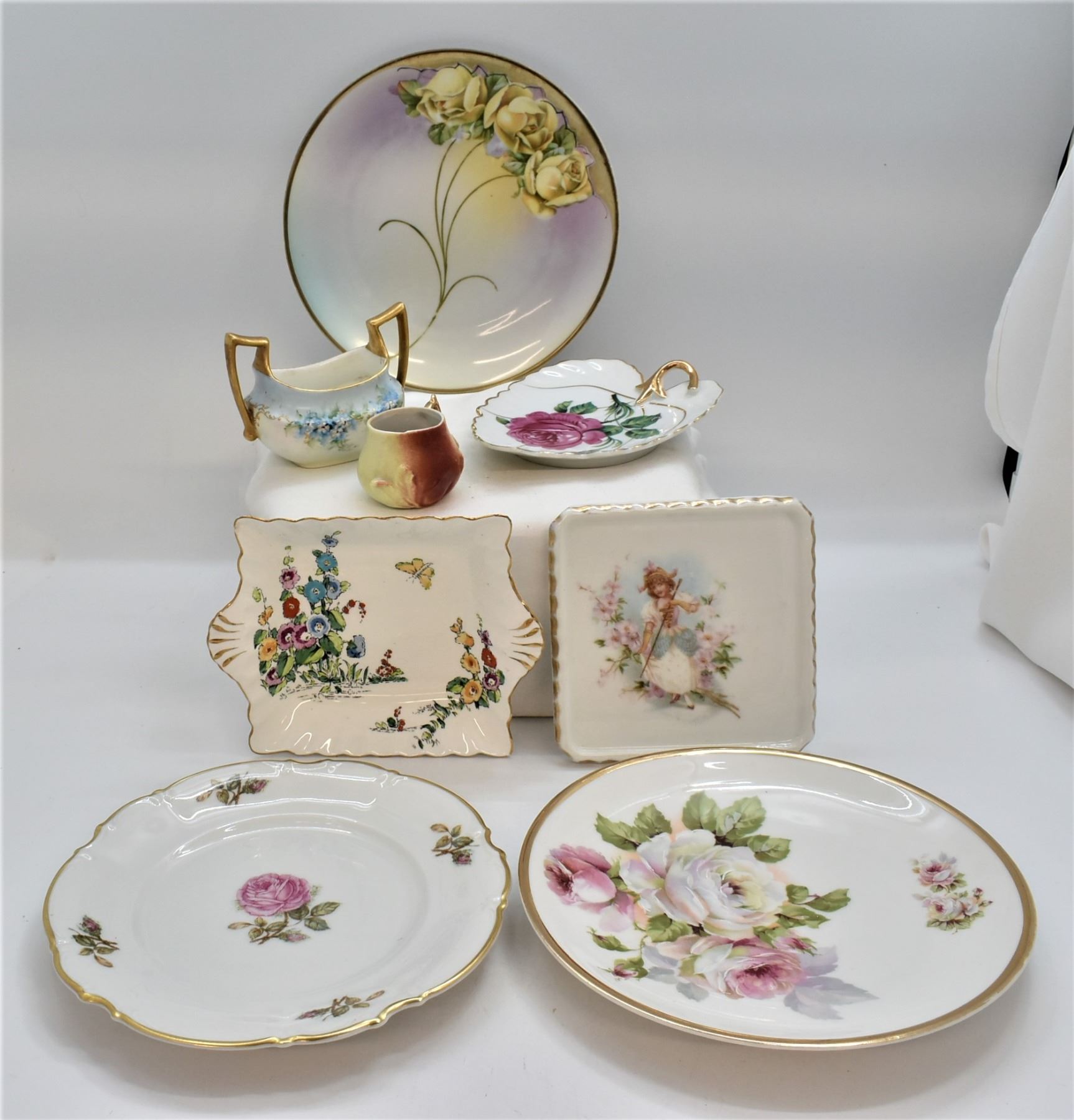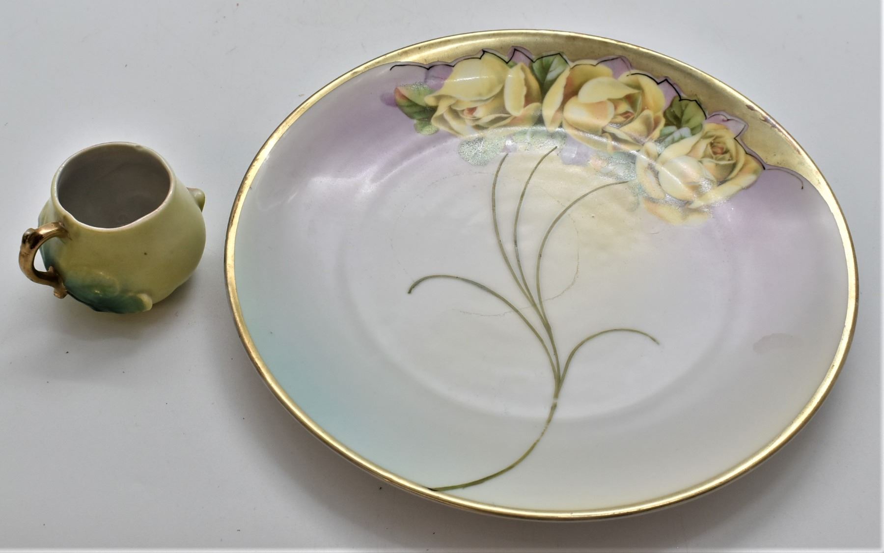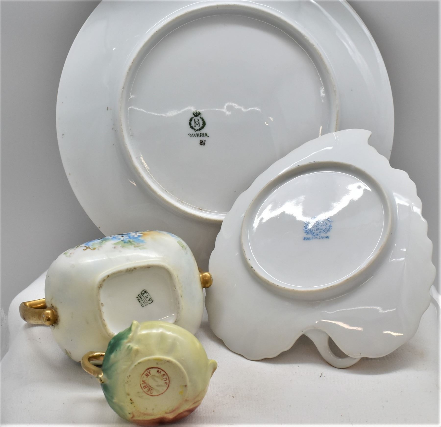 8 Pieces of Estate Antique and Vintage Gold Gilt Fine Porcelain China, includes 1. German Gold Gilt Cream Pitcher, marked on the bottom 2. Hand Painted Gold Gilt Sugar Bowl, ca. 1890s, hallmarked 3. Japanese Orion China Hand Painted Gold Gilt Leaf Plate, marked on the bottom 4. Crown Staffordshire Gold Gilt Bowl, made in England, hallmarked, small nip in 2 corners 5. Gold Gilt China Trivet 6. Bavaria Germany Hutschenreuther Gelb Porcelain ''Sylvia'' Rose pattern plate, gold gilt, marked on the bottom, ca. 1950s 7. German C.T. Altwasser Gold Gilt China Plate, hand painted, marked on the bottom, ca. late 1800s to early 1900s 8. Porzellanfabrik Moschendorf Bavaria China Plate, gold gilt, hand painted, ca. 1904 - 1938, marked on the bottom, largest plate measures 8.5''D