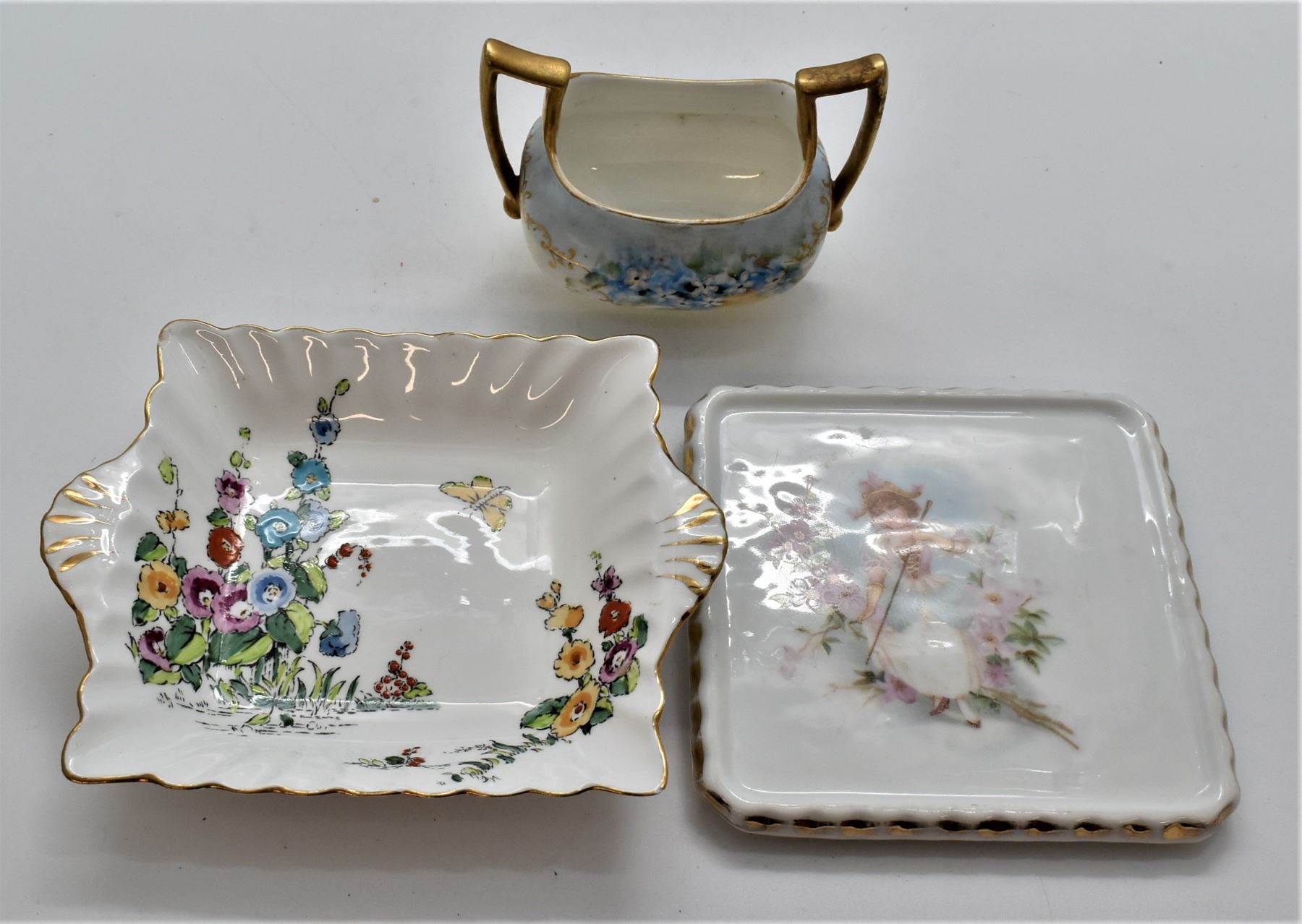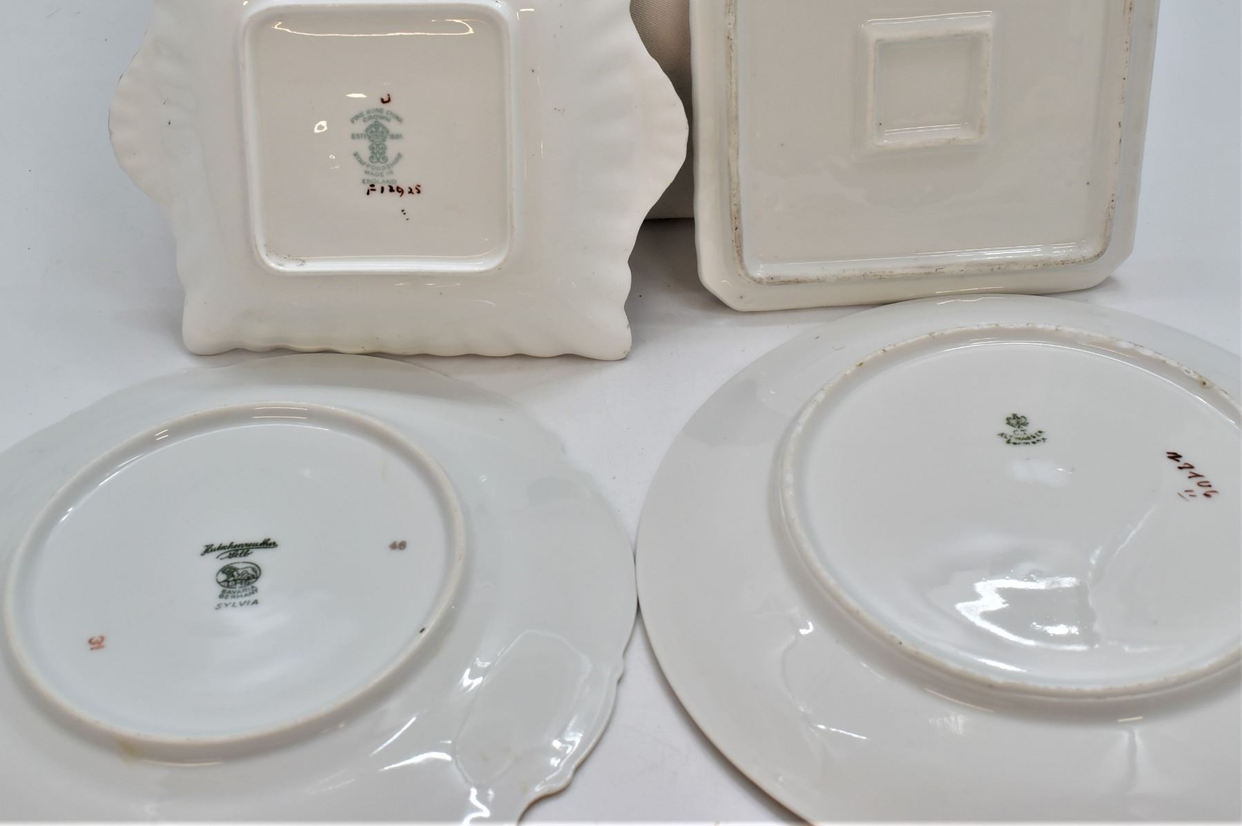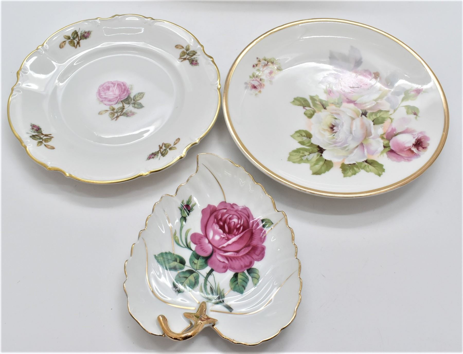 8 Pieces of Estate Antique and Vintage Gold Gilt Fine Porcelain China, includes 1. German Gold Gilt Cream Pitcher, marked on the bottom 2. Hand Painted Gold Gilt Sugar Bowl, ca. 1890s, hallmarked 3. Japanese Orion China Hand Painted Gold Gilt Leaf Plate, marked on the bottom 4. Crown Staffordshire Gold Gilt Bowl, made in England, hallmarked, small nip in 2 corners 5. Gold Gilt China Trivet 6. Bavaria Germany Hutschenreuther Gelb Porcelain ''Sylvia'' Rose pattern plate, gold gilt, marked on the bottom, ca. 1950s 7. German C.T. Altwasser Gold Gilt China Plate, hand painted, marked on the bottom, ca. late 1800s to early 1900s 8. Porzellanfabrik Moschendorf Bavaria China Plate, gold gilt, hand painted, ca. 1904 - 1938, marked on the bottom, largest plate measures 8.5''D