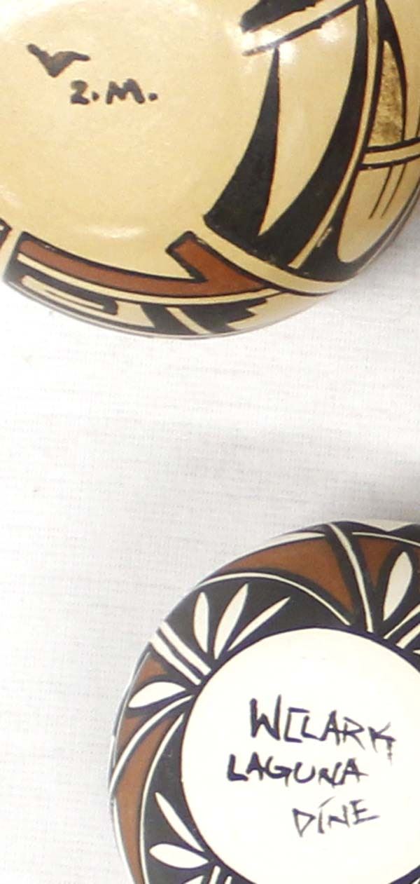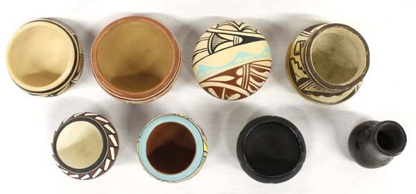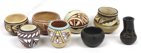 8 Pieces of Native American Pottery, largest measures 2.5'' x 3'' and includes 1. Laguna by W. Clark 2. Jemez by M. Chinana 3. Santo Domingo Matte on Black 4. Historic Hopi Pottery Bowl 5. Jemez Poster Paint Pottery Jar by C.J. 6. San Juan 7. Hopi by Z.M. 8. Santo Domingo Pulled Spout Vase