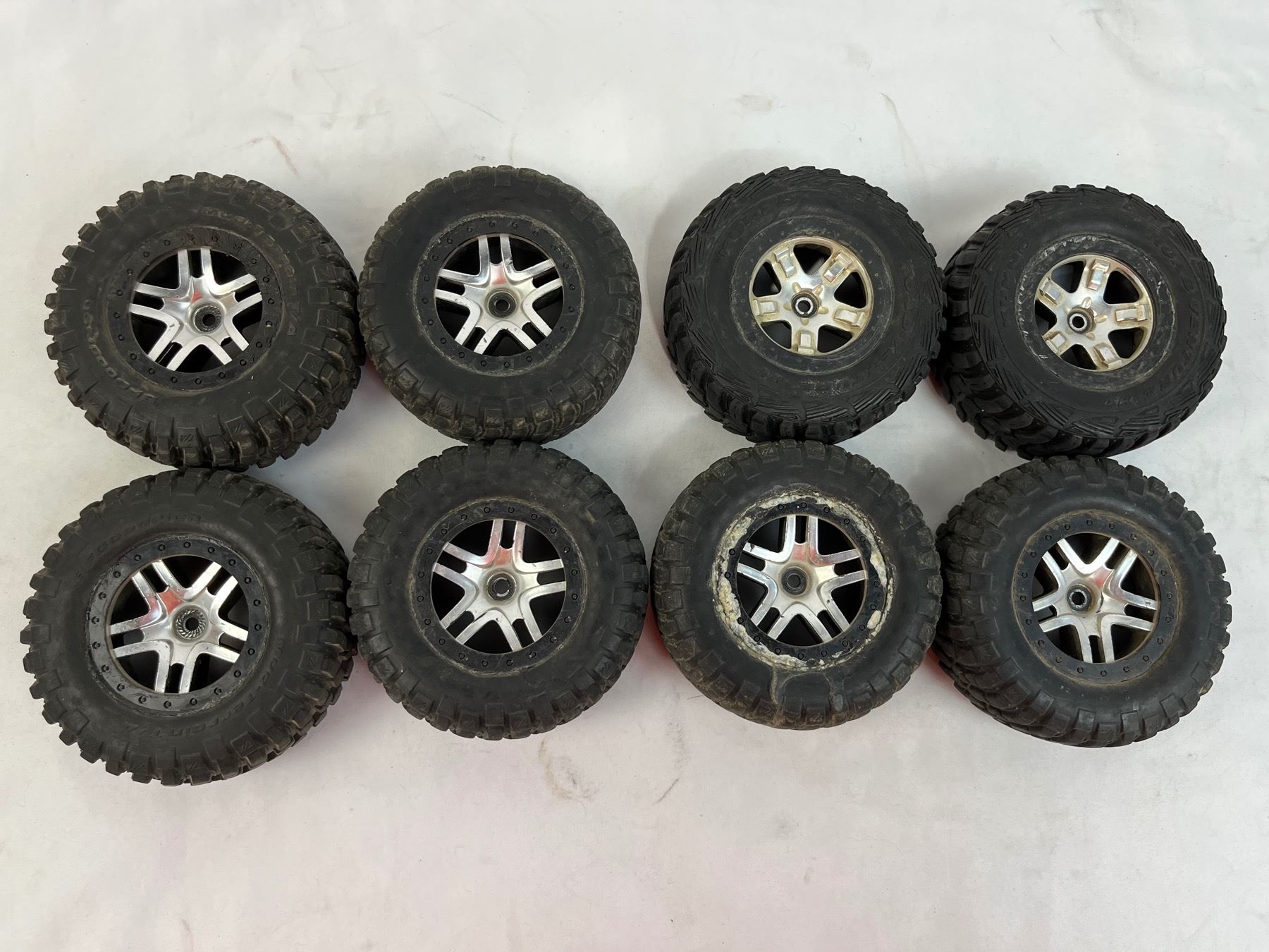 Used condition - 1 full set of 4 with 4" diameter - 2 BF Goodrich Mud Terrain T/4 - 2 Road Venture MT, Kumho 4" diameter