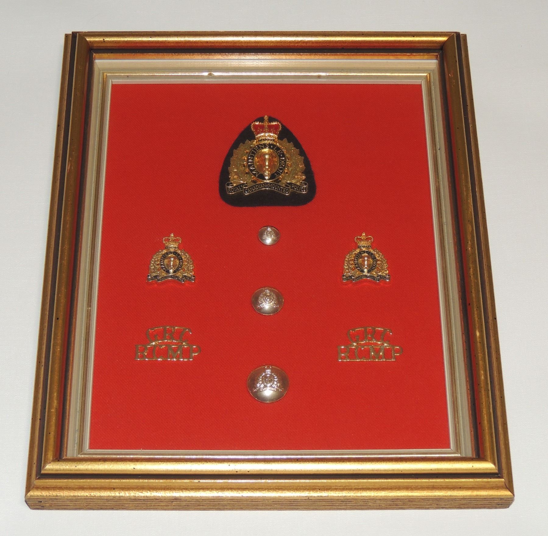 INCLUDING 3 BUTTONS IN FRAME INC. QUEENS CROWN RCMP CAP BADGE SHOULDER TITLES COLLAR BADGE CANADIAN LAW ENFORCEMET CANADA ROYAL CANADIAN MOUNTED POLICE