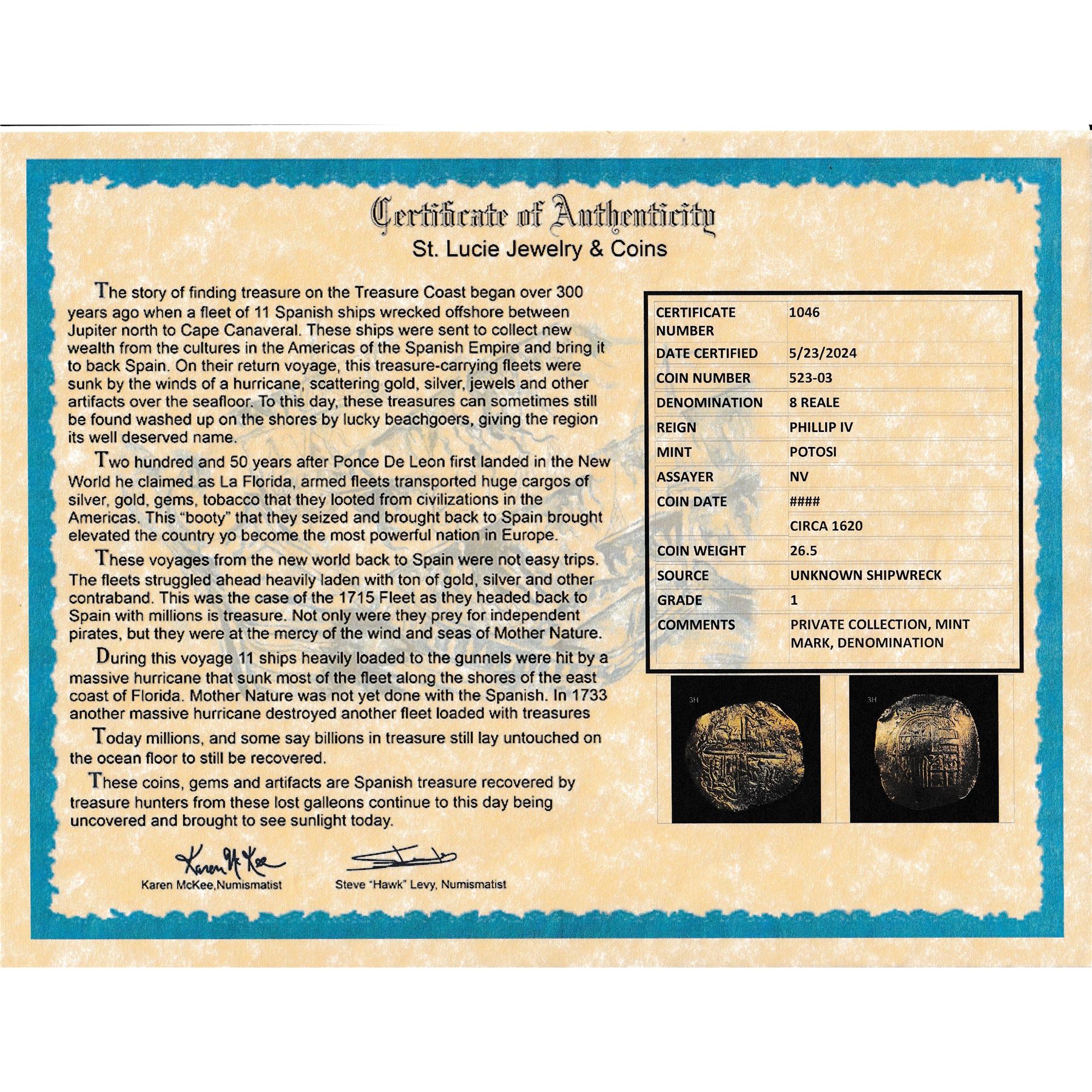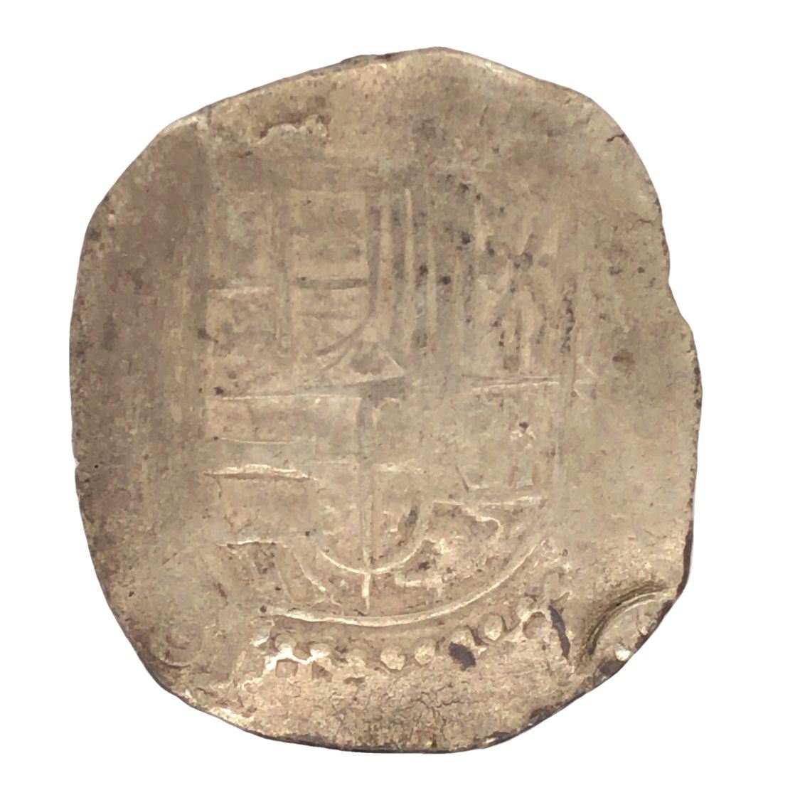 DESCRIPTION DETAIL: An authentic 8 Reale Treasure Coin from a private collection. This coin has a full cross and shield with a nice strike. Surfaces have some original patina and slight encrustations. Nice Full weight 8 Reals.