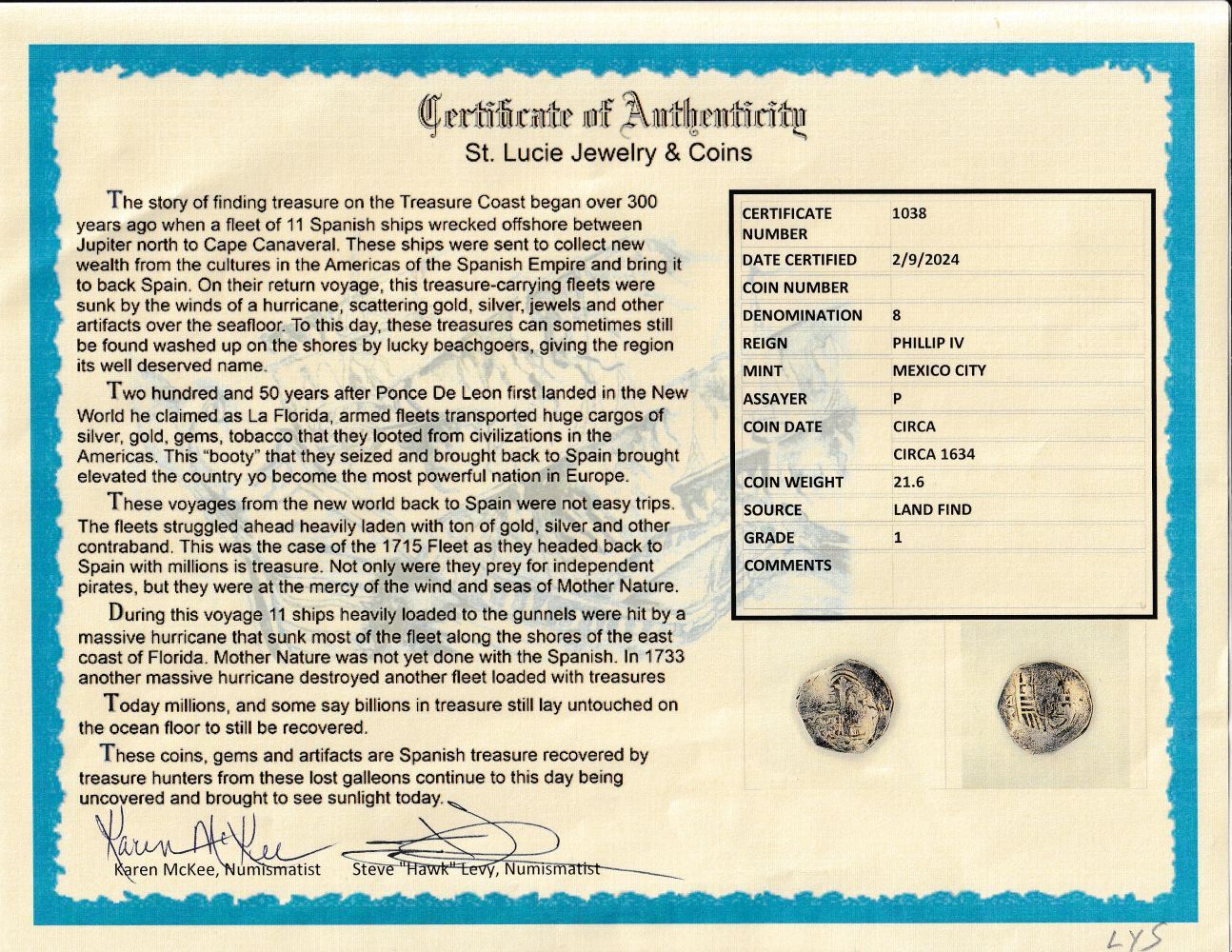 TITLE DESCRIPTION: 8 Reale Certified Treasure Coin