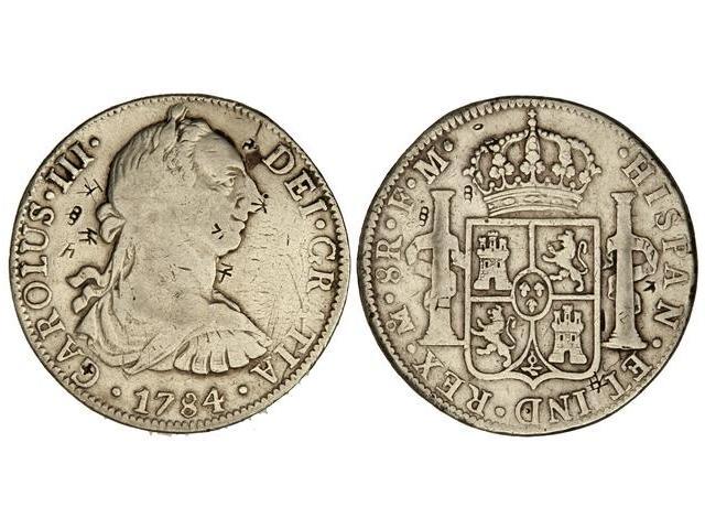 8 Reales. 1784. MÉXICO. F.M. Con resellos chinos. (Golpes). Cal-936. MBC-.