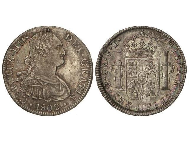 8 Reales. - 1802. - MÉXICO. - F.T. - Pátina irisada. (Rayitas. Pequeños golpecitos y golpe en canto). Cal-698. EBC-. - -
