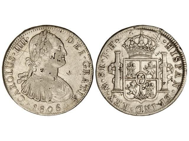 8 Reales. 1805. MÉXICO. T.H. Resellos chinos. (Rayas). Cal-703. MBC/MBC+.