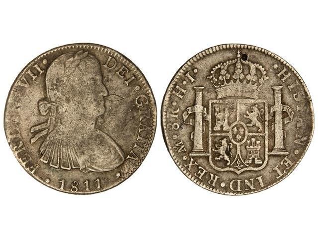 8 Reales. 1811. MÉXICO. H.J. (Intento de perforación en reverso. Grafiti en anverso). Cal-546. MBC-.