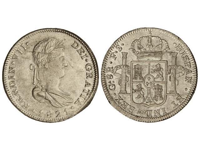 8 Reales. 1821. GUADALAJARA. F.S. Escusón del reverso con una flor de lis arriba y dos abajo. (Ínfimo golpecito en campo. Rotura de cuño en anverso). Magnífico ejemplar. RARA. Cal-448. EBC/EBC-.