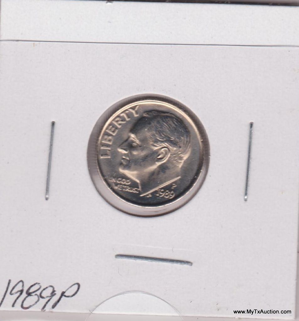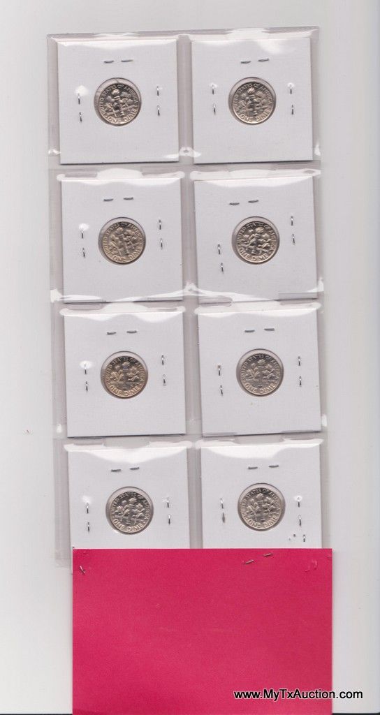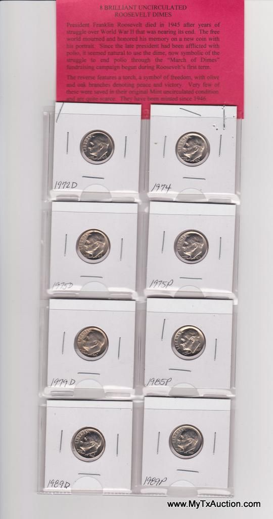 8 uncirculated 10 Cents "Roosevelt Dimes" (COMMEMORATIVE ISSUE 1st Anniversary of Roosevelt's Death) one each 1972D, 1974, 1975D, 1975P, 1979D, 1985P, 1989D & 1989P - Country:United States - Coin Mint Years:1965-2013 - Metal:Copper-nickel clad Copper - Weight:2.268g - Diameter:17.91mm - Thickness:1.35mm - Design Obverse:The portrait in left profile of Franklin D. Roosevelt, the 32nd President of the United States from 1933 to his death in 1945, accompanied with the motto: "IN GOD WE TRUST" and surrounded with the lettering "LIBERTY". NOTE: A silver proof was minted, KM#A195NOTE: different mint varieties exist. 1) Philadelphia without mintmark, 1964-1979 2) Philadelphia "P" on obverse, 1980-date 3) Denver "D" on obverse, 1968-date 4) San Francisco "S" on obverse, Proof Issues, 1968-date 5) San Francisco without mintmark, 1968,1970,1975,1983 6) West Point "W" on obverse, 1996 (Mint sets only) NOTE: Type II Proofs have a clearer mintmark than Type I Proofs. Lettering:LIBERTY IN GOD WE TRUST (DATE & MINT LETTER) JS - Reverse: Ahead the motto "E • PLU RIB US • U NUM", an olive branch, a torch and an oak branch symbolize respectively peace, liberty and victory and are surrounded with the facial value and the lettering "UNITED STATES OF AMERICA" Lettering:E • PLU RIB US • U NUM UNITED STATES OF AMERICA • ONE DIME • - Engravers:John R. Sinnock - Shape:Round - Edge:Reeded (118 reeds)