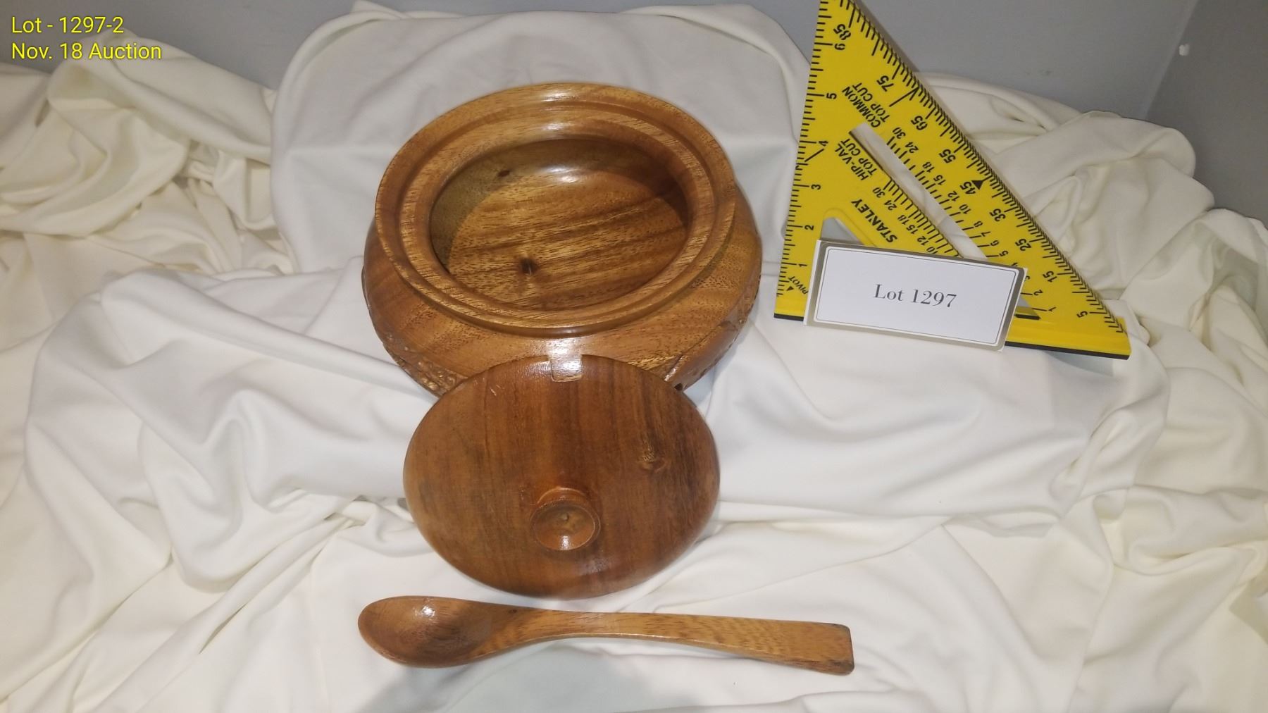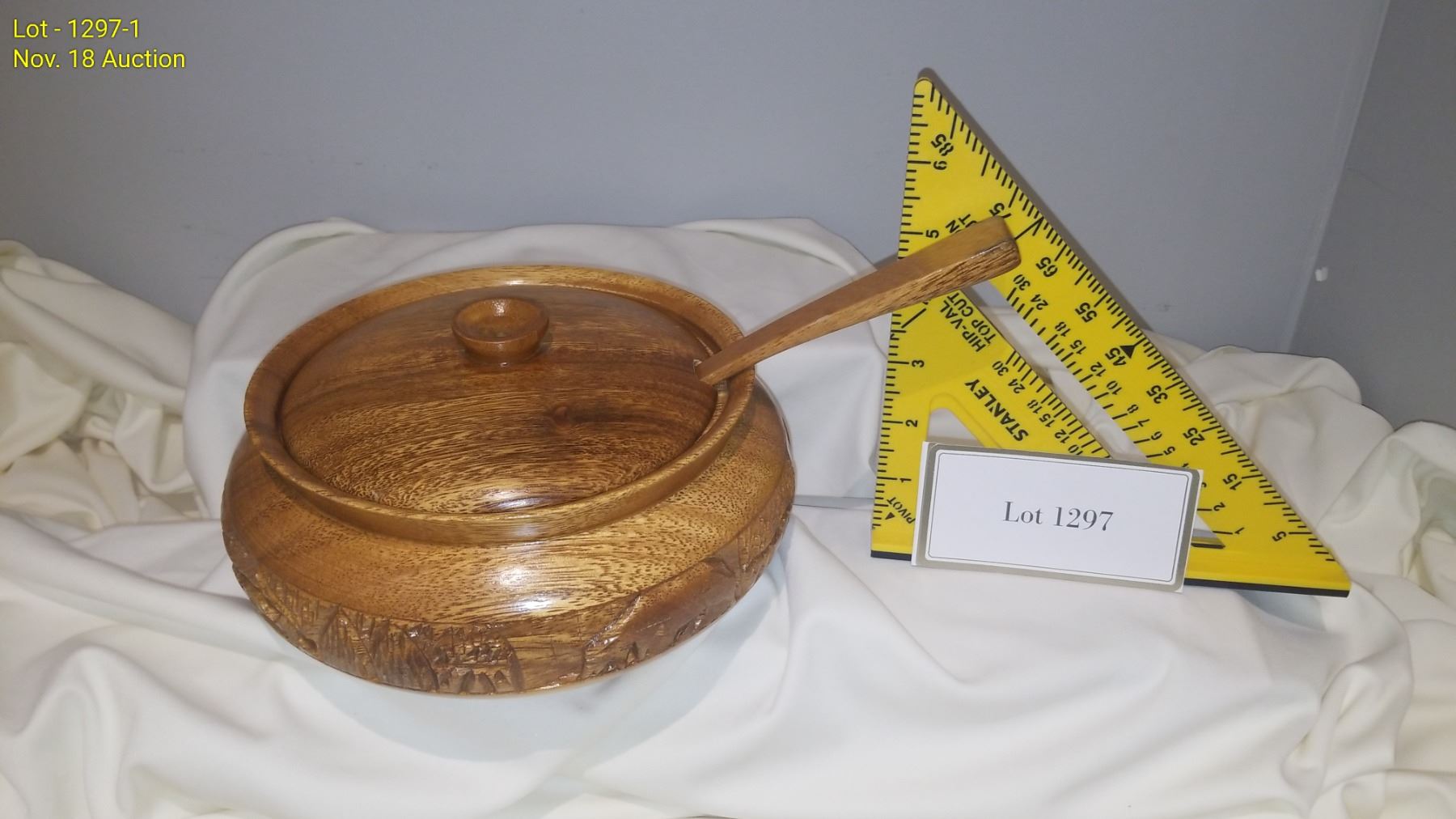 8" Round Carved Wodden Bowl with Lid and Spoon