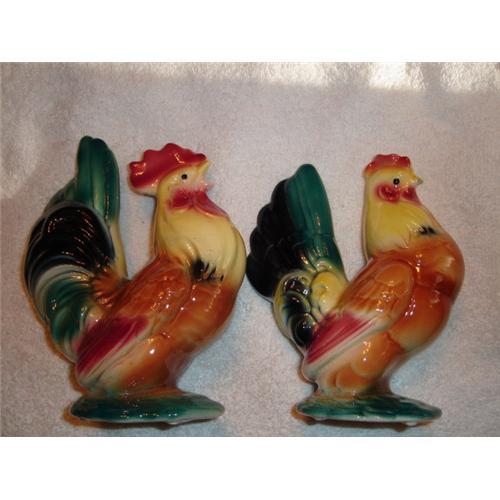 This is for the 8.25" Royal Copley Rooster and Hen Set. The Rooster is 8.25" High at his tail. He has the beautiful colors and blends that Copley is noted for. He has a beautiful shiny glaze. Under the glossy glaze there is general light age crazing. There are no chips, cracks, or repairs. The hen is 7.5" High at tail. She has the same beautiful colors and blends that Copley is noted for. She also has a beautiful shiny glaze. Under the glossy glaze is general light age crazing. There are no chips, cracks, or repairs.