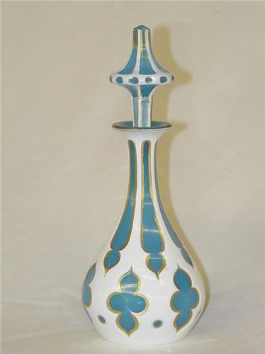 8" SANDWICH CUT OVERLAY COLOGNE BOTTLE W/ STOPPER- WHITE CUT TO BLUE W/ GOLD HIGHLIGHTS - OLD REPAIR TO STOPPER, GOLD WEAR