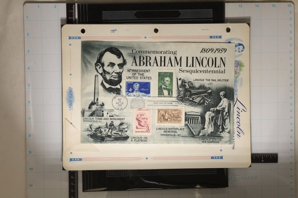 SHEET ONE HAS 3 STAMPS (3, 3 & 4 CENT) UNCANCELLED, SHEET 2 HAS 10 CANCELLED FOREIGN STAMPS WITH LINCOLN AND ON THE BACK HAS 8 MORE FOREIGN CANCELLED STAMPS, SHEET 3 HAS 6 -FOUR CENT CANCELLED STAMPS, SHEET 4 HAS TWO